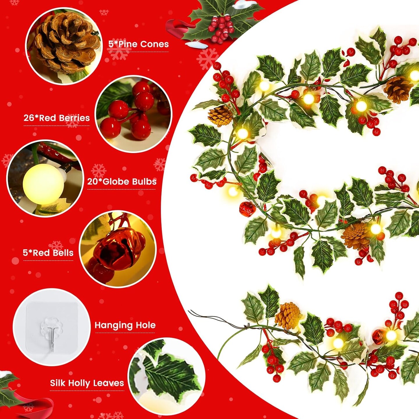 2 Pack Pre-Lit Christmas Garland with Lights, 5.7FT 20LED Battery Operated Lighted Garland Xmas Decor with PineCones Bell Berry Holly Leaves, Light Up Garland for Mantle Fireplace Stair Indoor Outdoor