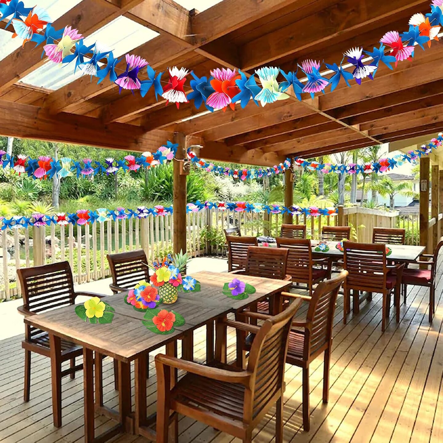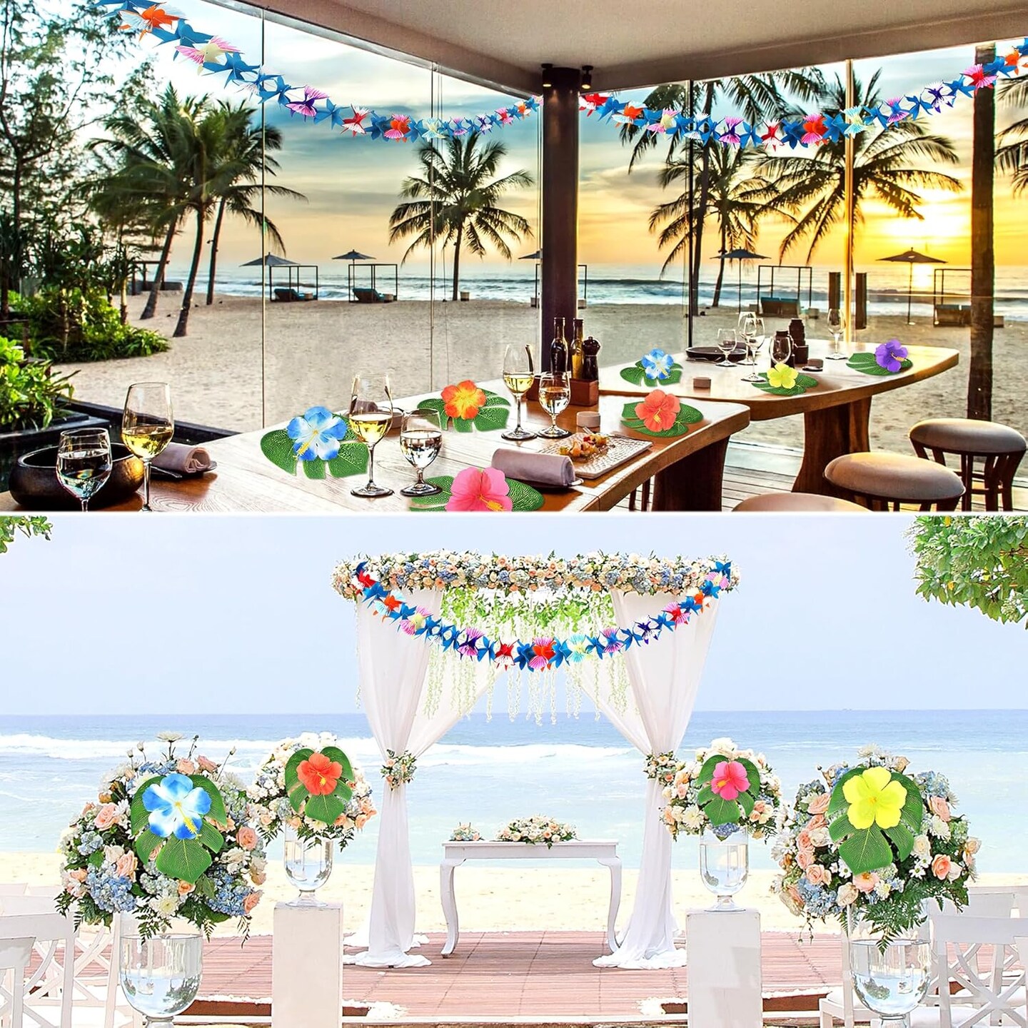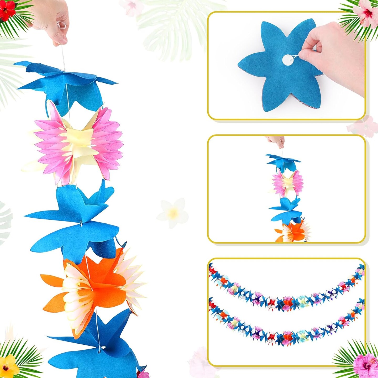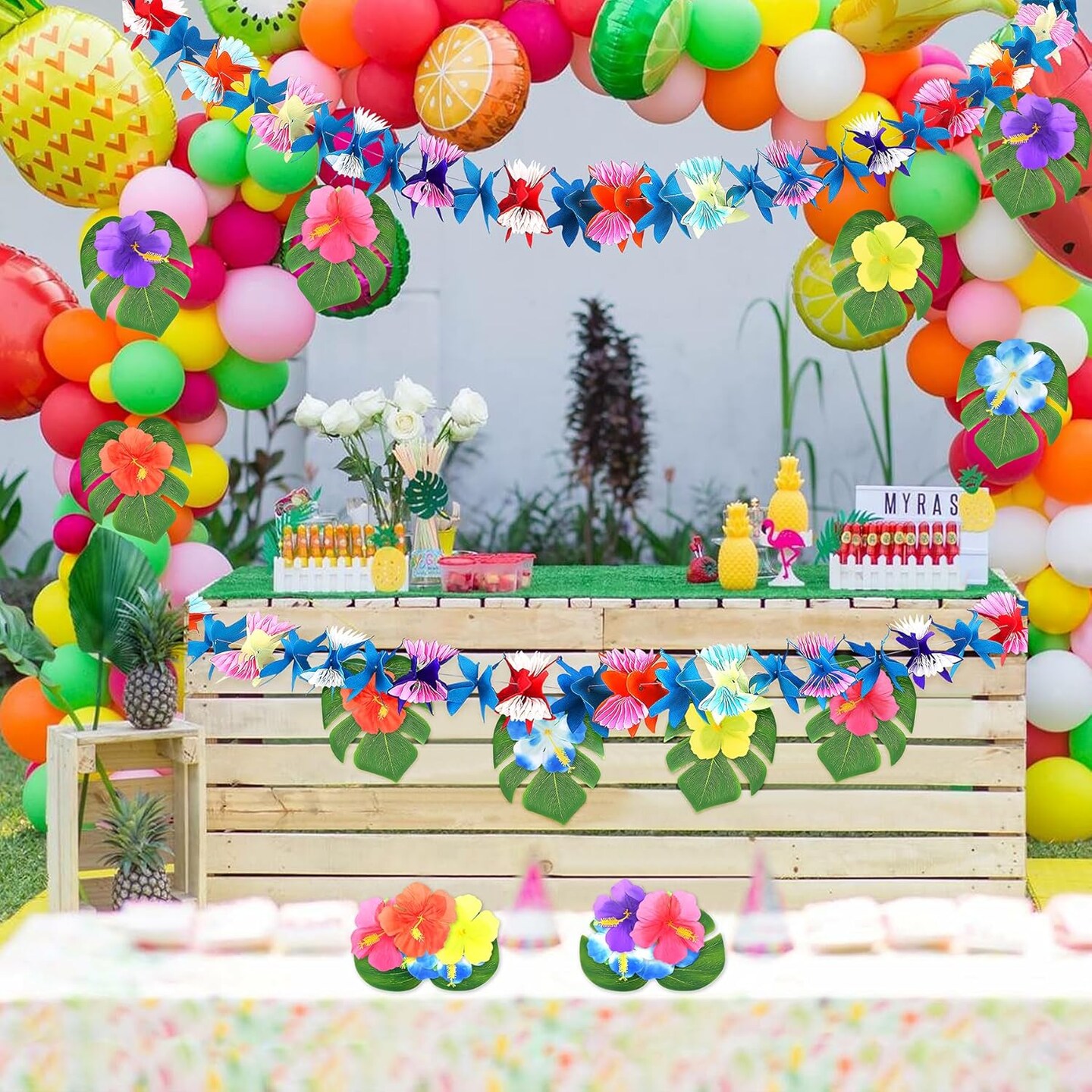 2 Pack Tropical Tissue Flower Garland for Luau Party Decoration, 24PCS Artificial Hibiscus and Palm Leaves for Hawaiian Party Decoration, Summer Tropical Banner for Aloha Birthday Theme Parties Decor