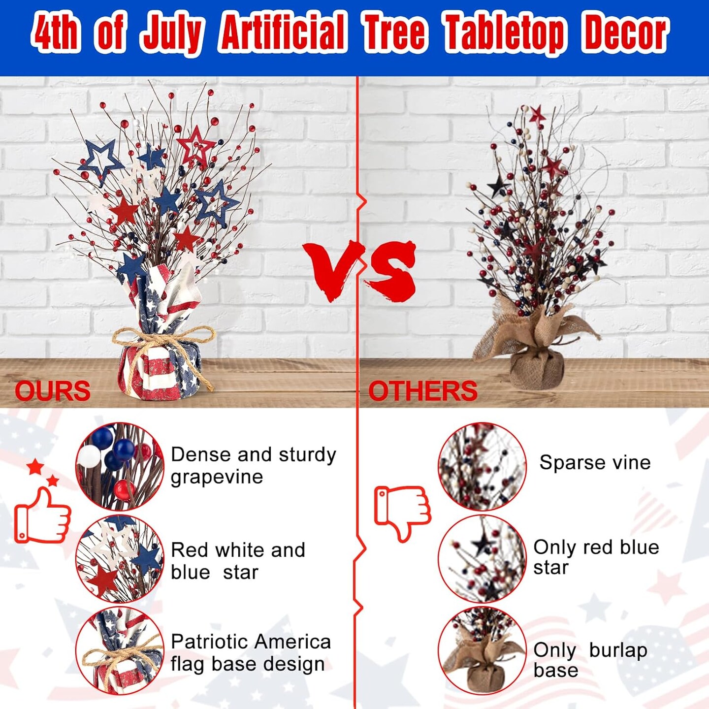 2 Packs 4th of July Artificial Tree Berry Stem Picks Wooden Star Tabletop Decor