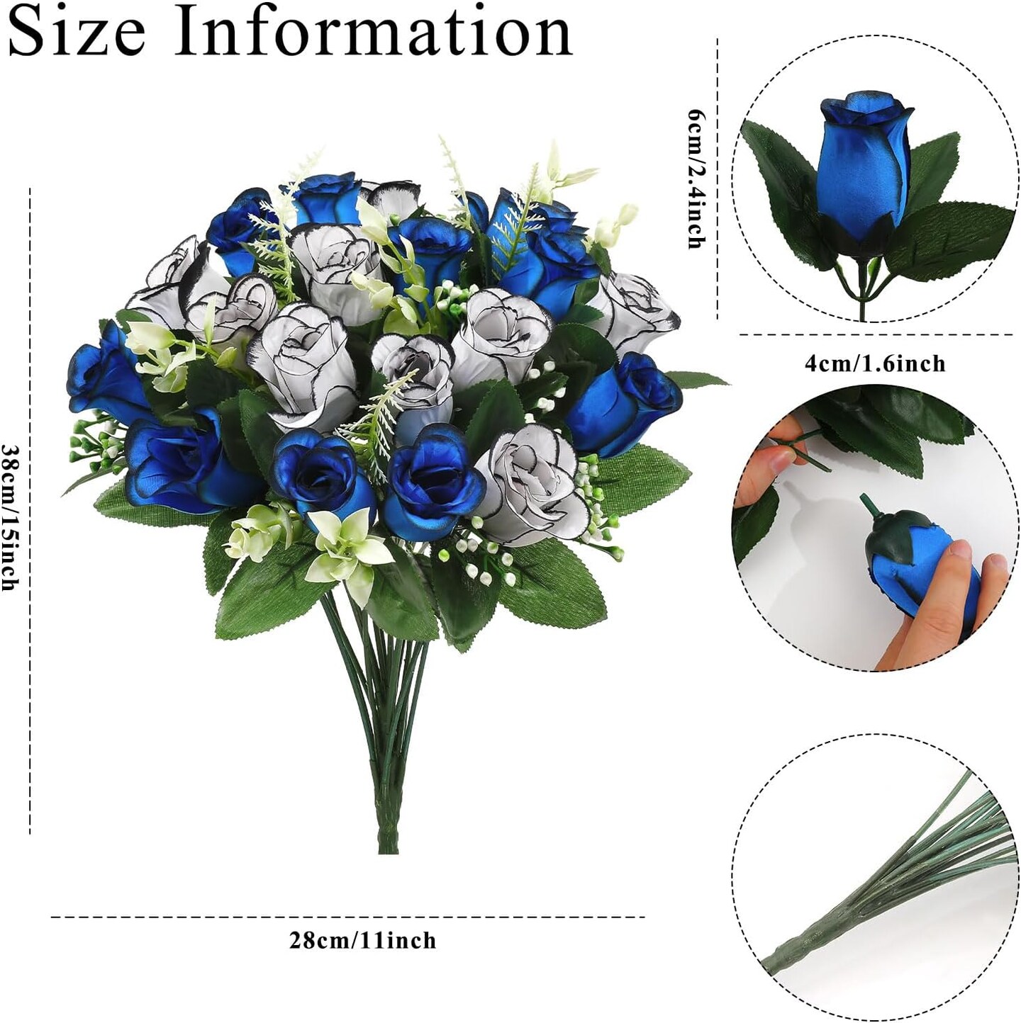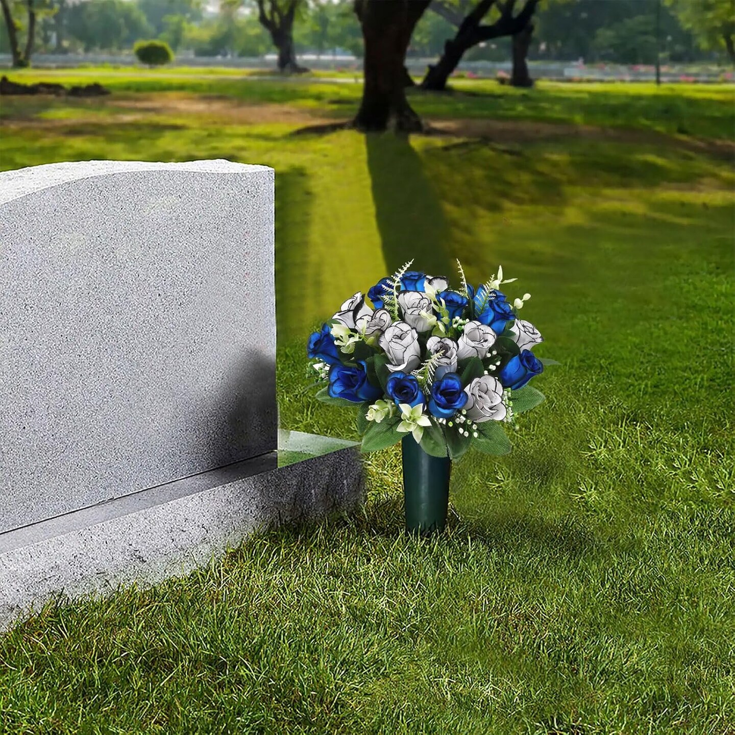 2 Pcs Artificial Cemetery Flowers with Vase – Blue & White Silk Roses, Memorial Grave Flowers for Outdoor Headstones, Cemetery Flower Arrangements