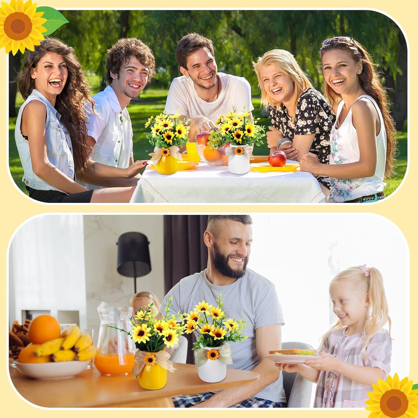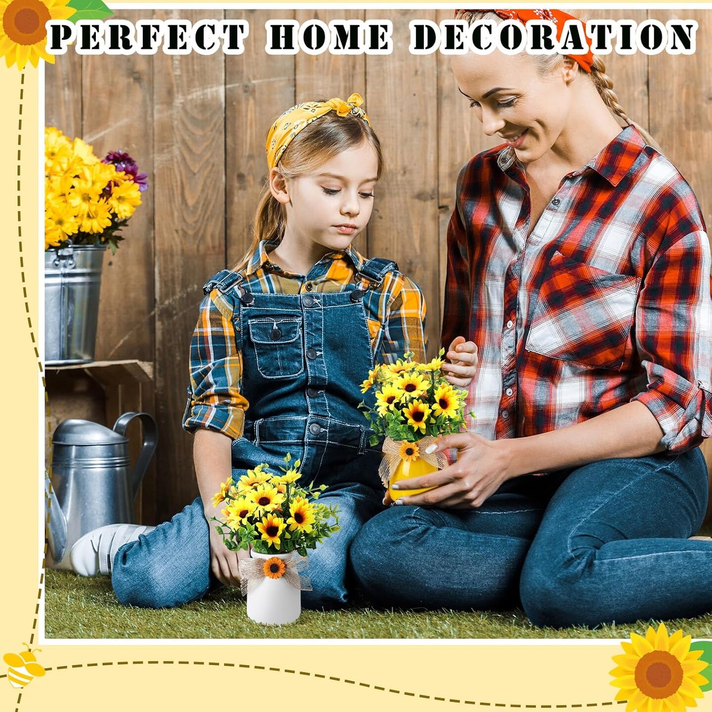 (2 Pcs) Artificial Fake Flowers with Vase Decoration (White, Yellow, Green) 2.5"D x 2.5"W x 3.2"H