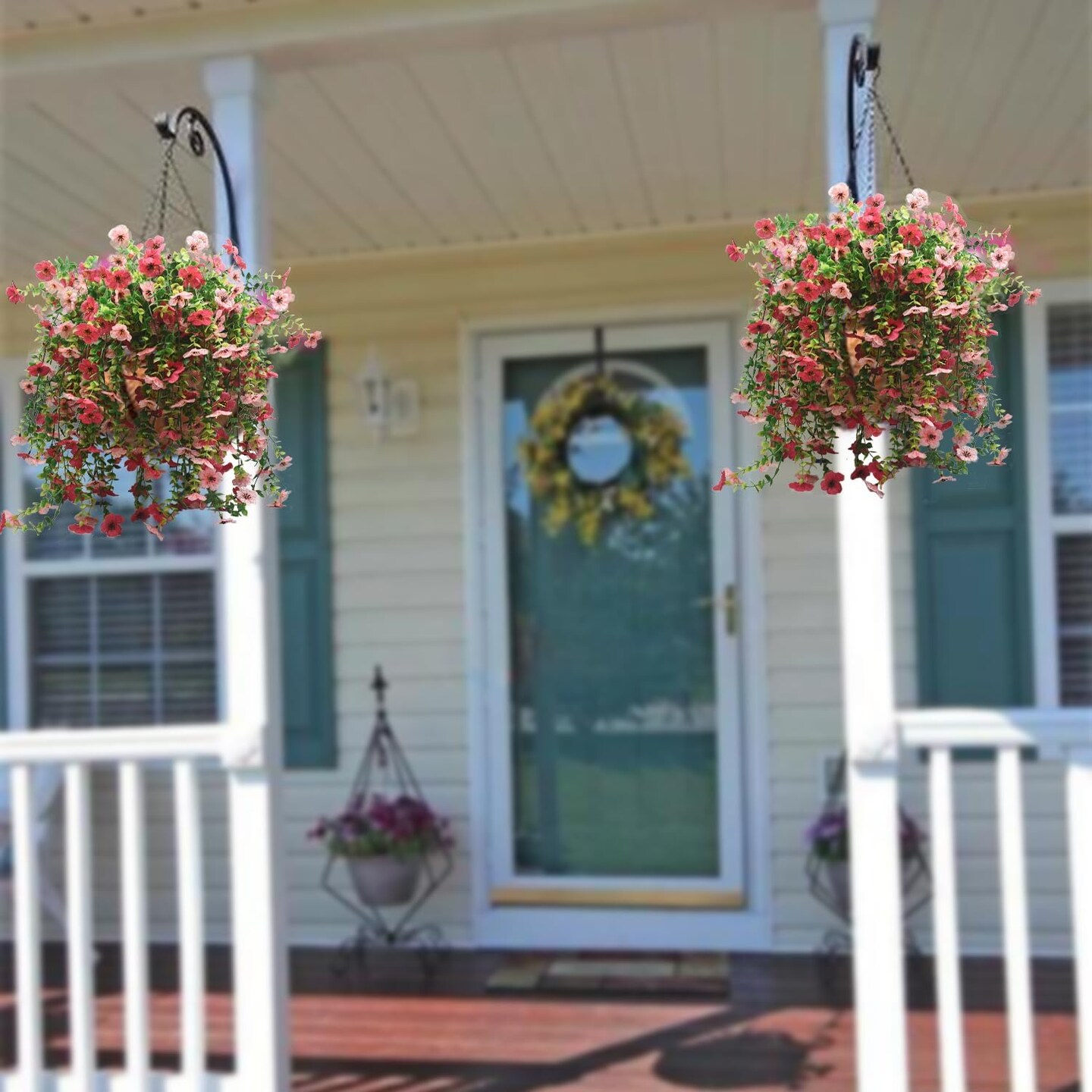 2 Pcs Artificial Hanging Flowers Plants for Outdoor Spring Decoration (Pink+Rose Red)