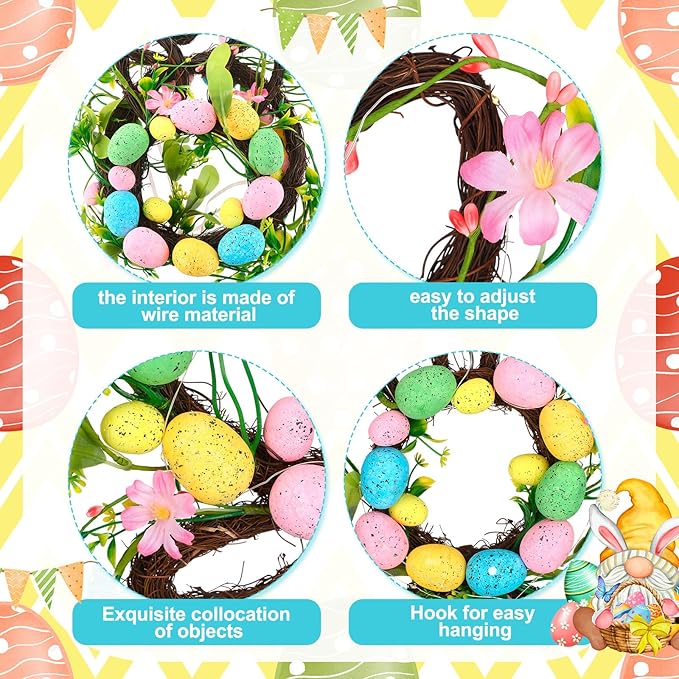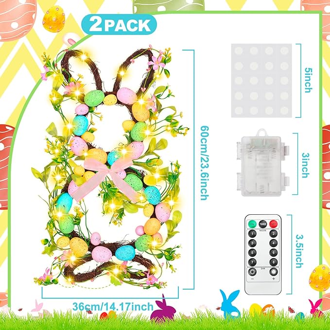 2 Pcs Easter Bunny Spring Wreath with 20 LED Lights 23.6'' Easter Rabbit Door Wreath with Bow Eggs Hanging Bunny Wreaths for Front Door Easter Door Hanger for Spring Outdoor Wall Home Decoration