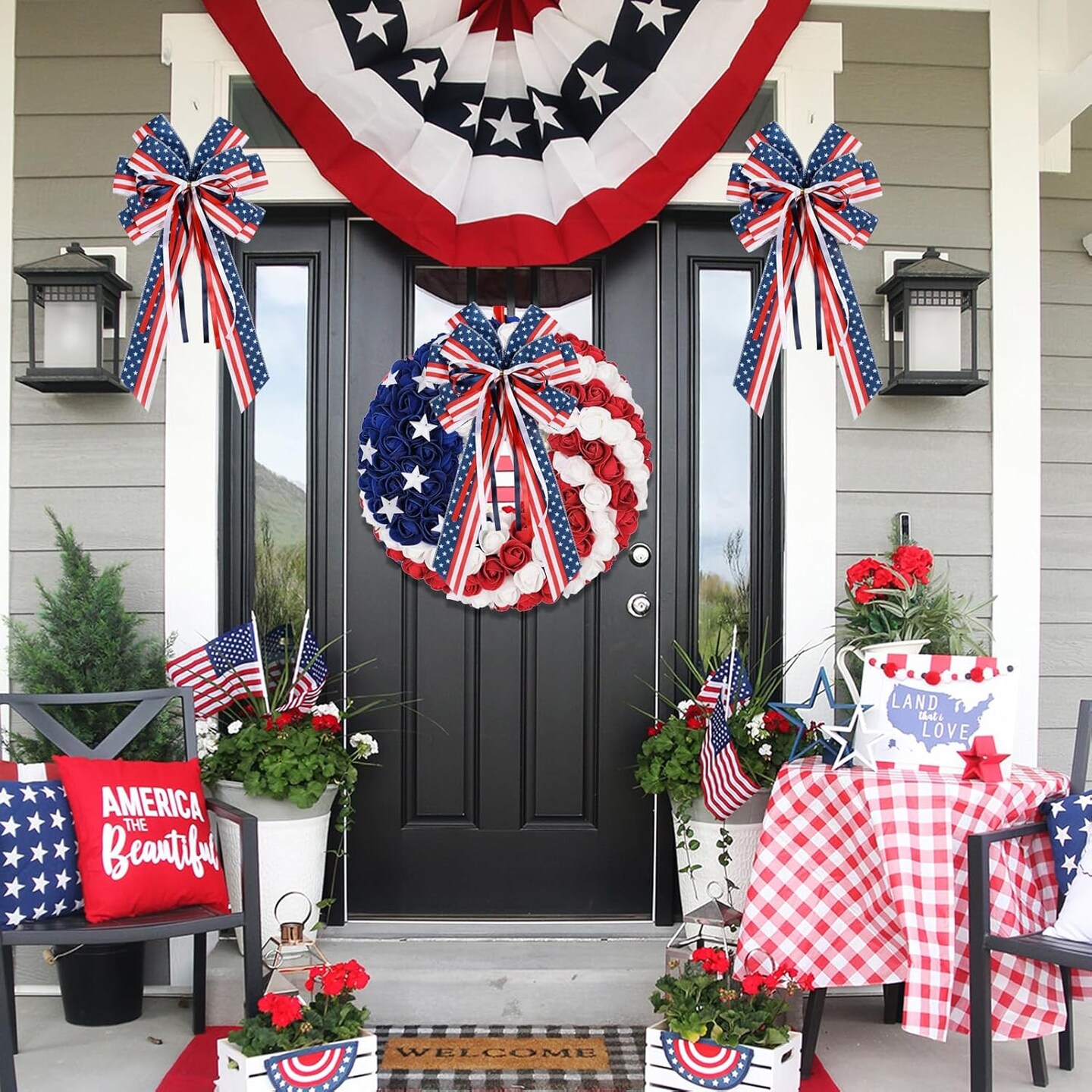 2 PCS Large Patriotic Wreath Bows – Red, White & Blue Stars and Stripes Ribbon Bows for 4th of July, Independence Day, Memorial Day, Veterans Day – American Flag Front Door Indoor & Outdoor Decorations