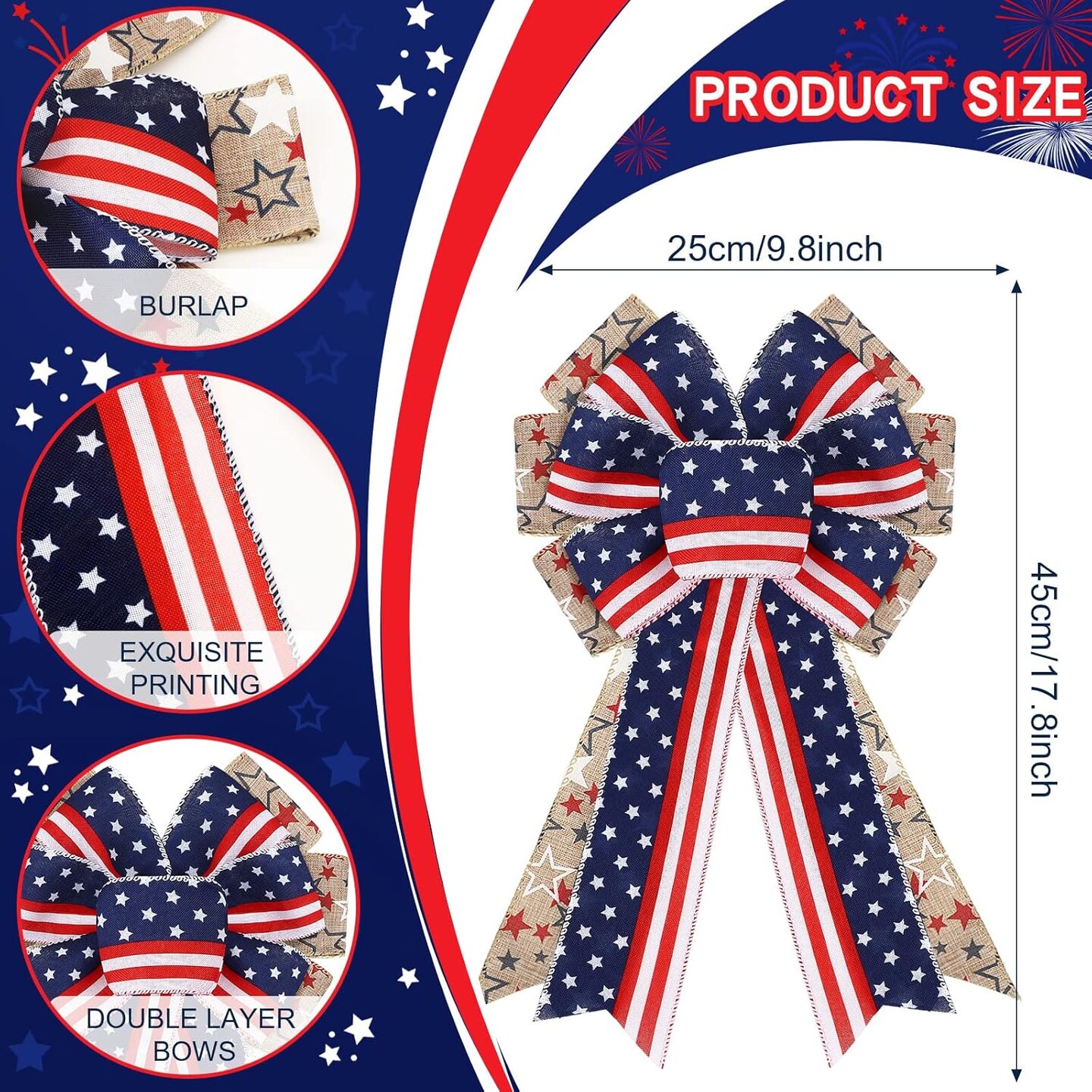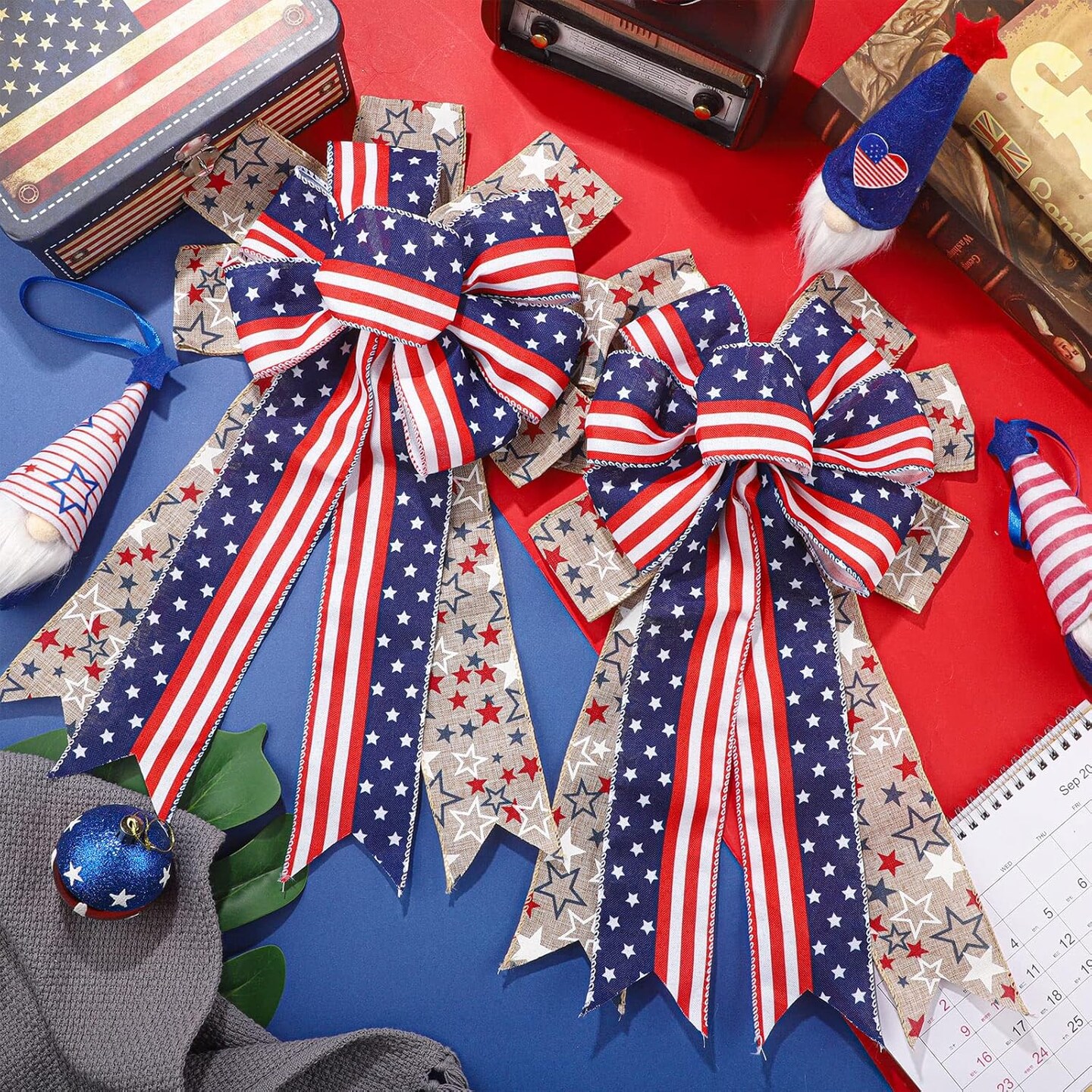 2 Pcs Patriotic Bow 4th of July Wreath Bow Red White Blue Star Burlap Bow Memorial Day American Flag Bow for Indoor Outdoor Tree Topper Independence Day Party Decoration(Star Style)