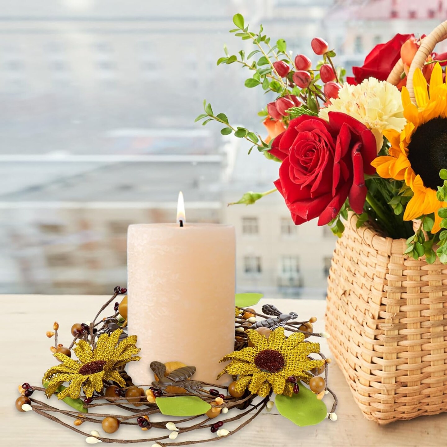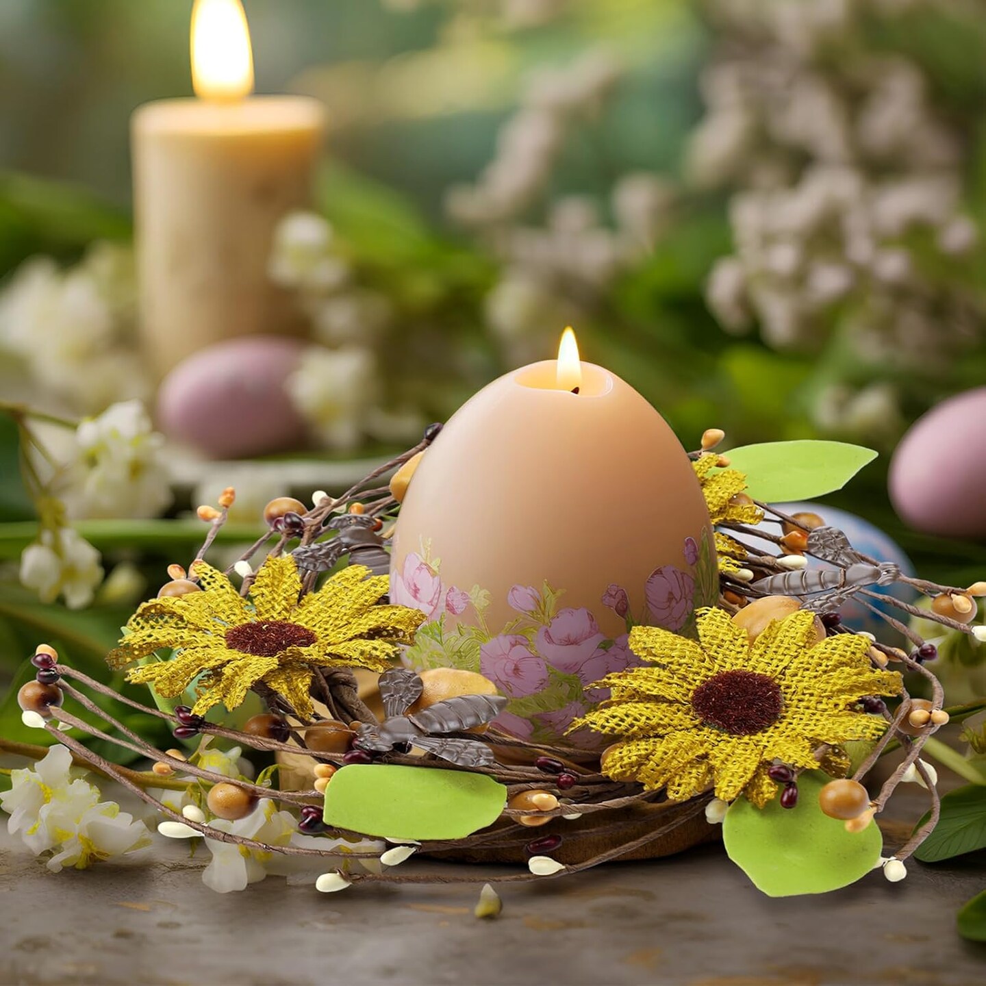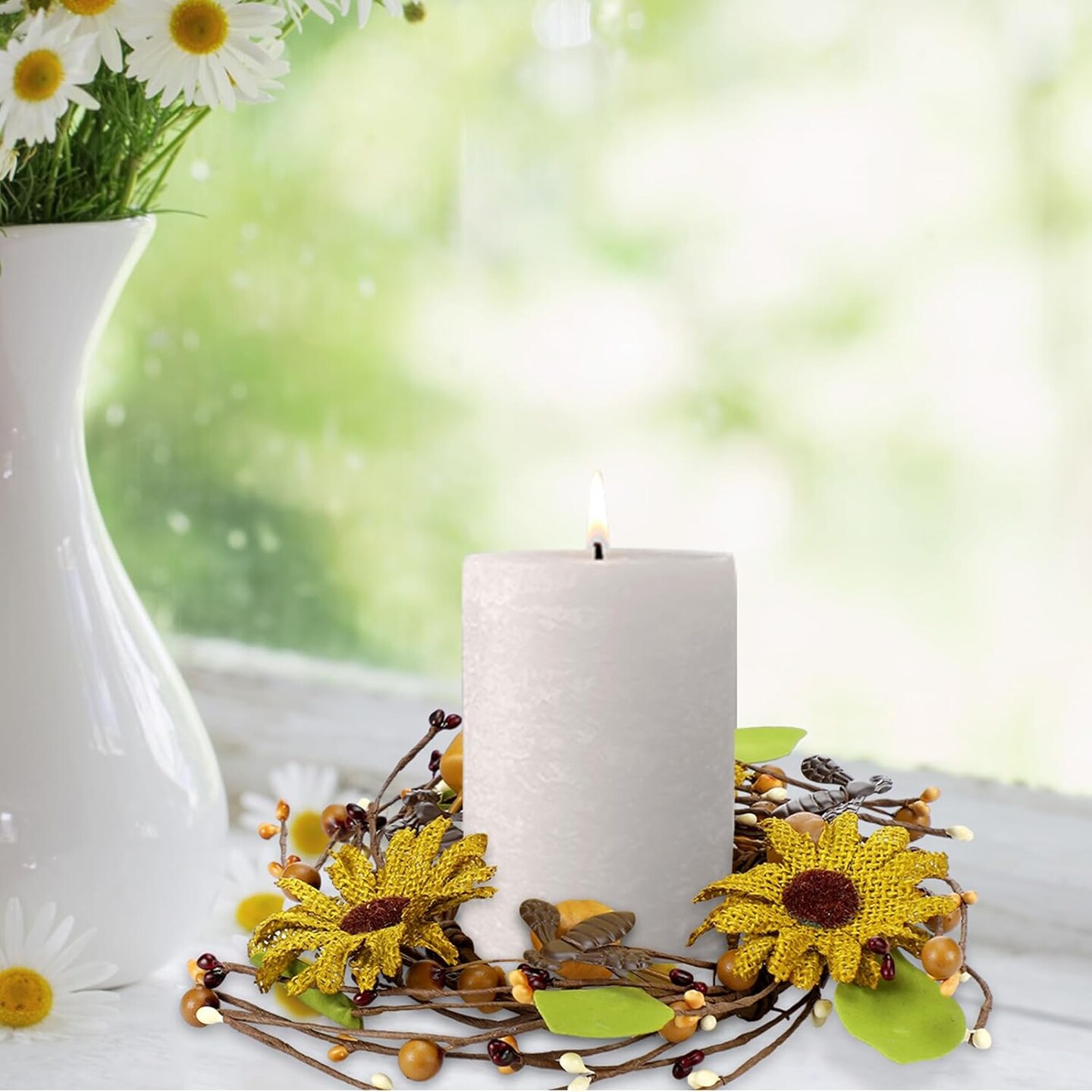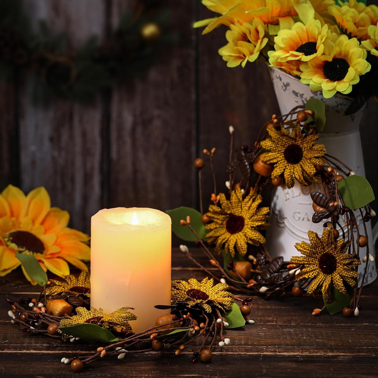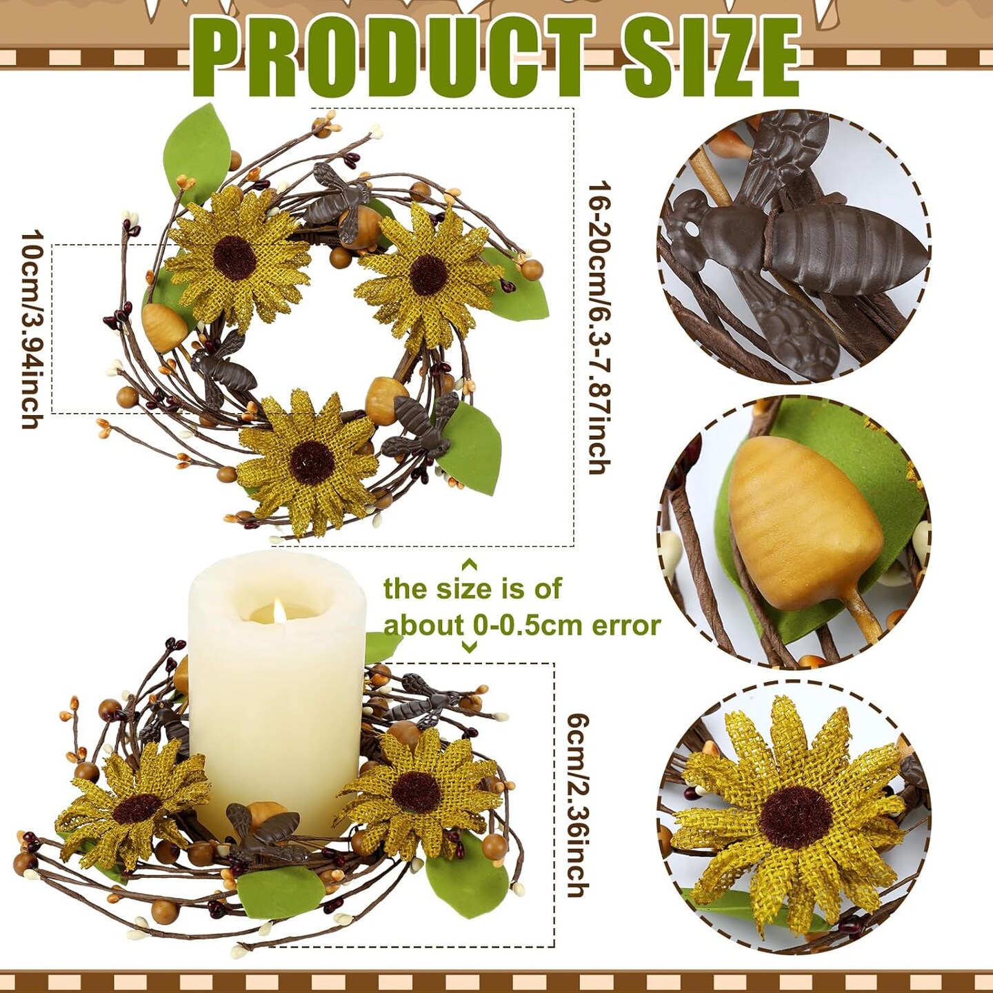 2 Pcs Retro Spring Sunflower Candle Wreaths – 6-Inch Candle Rings with Sunflowers, Honeycomb Leaves & Pillar Decor for Indoor & Outdoor Tables, Holiday & Seasonal Centerpieces