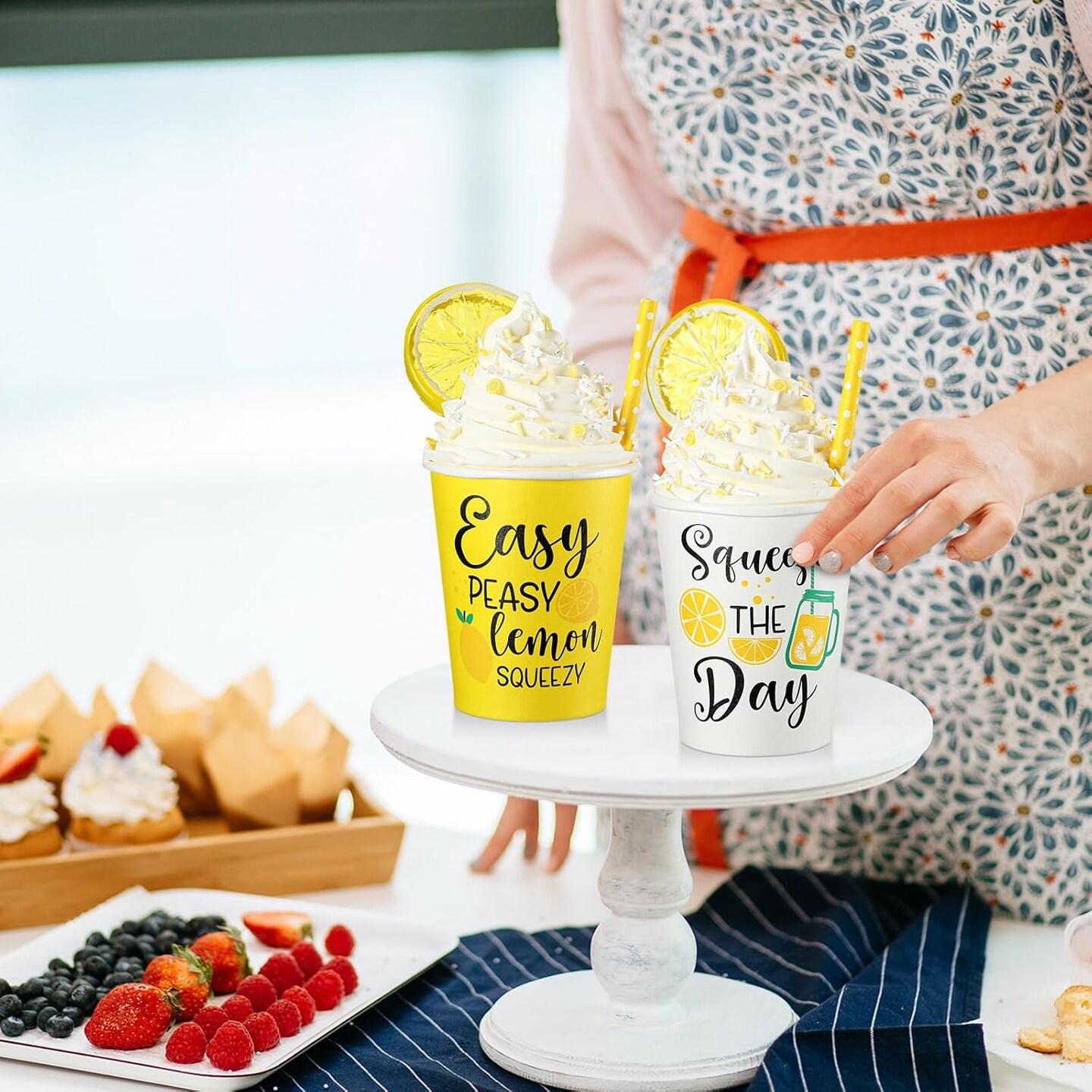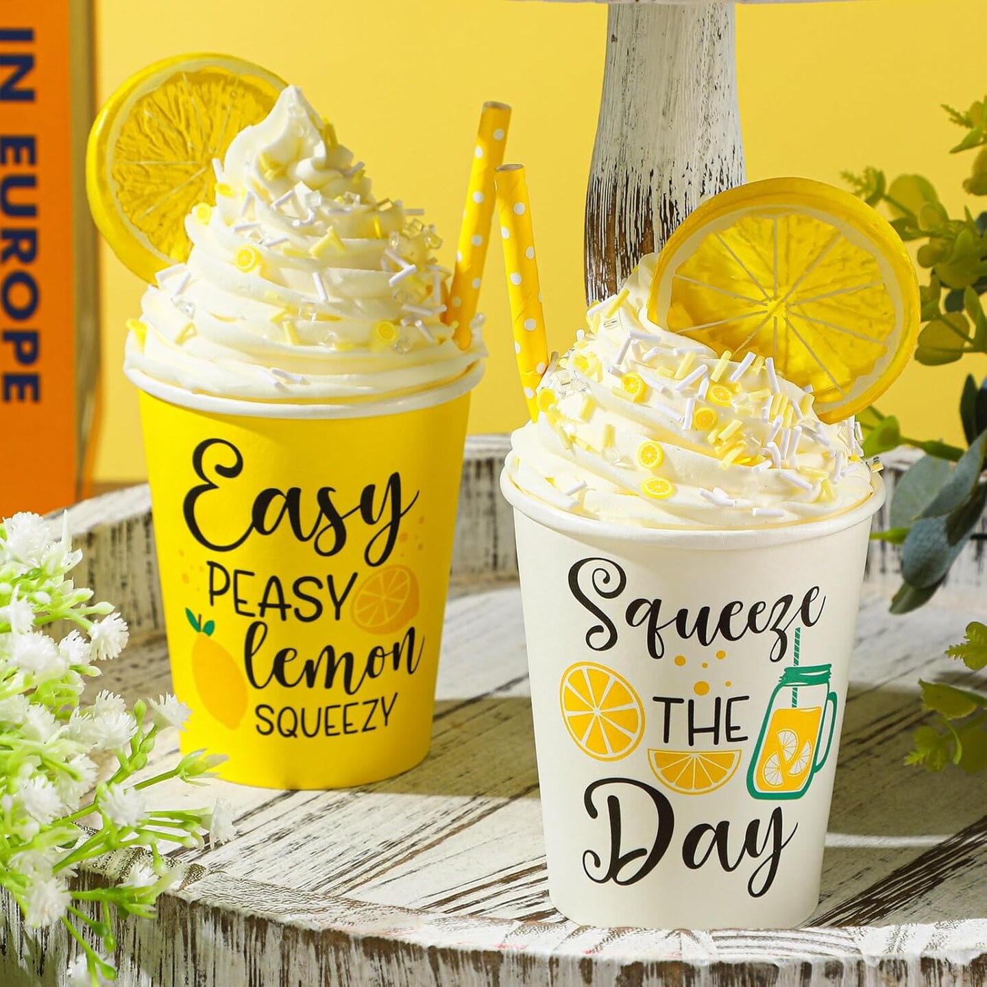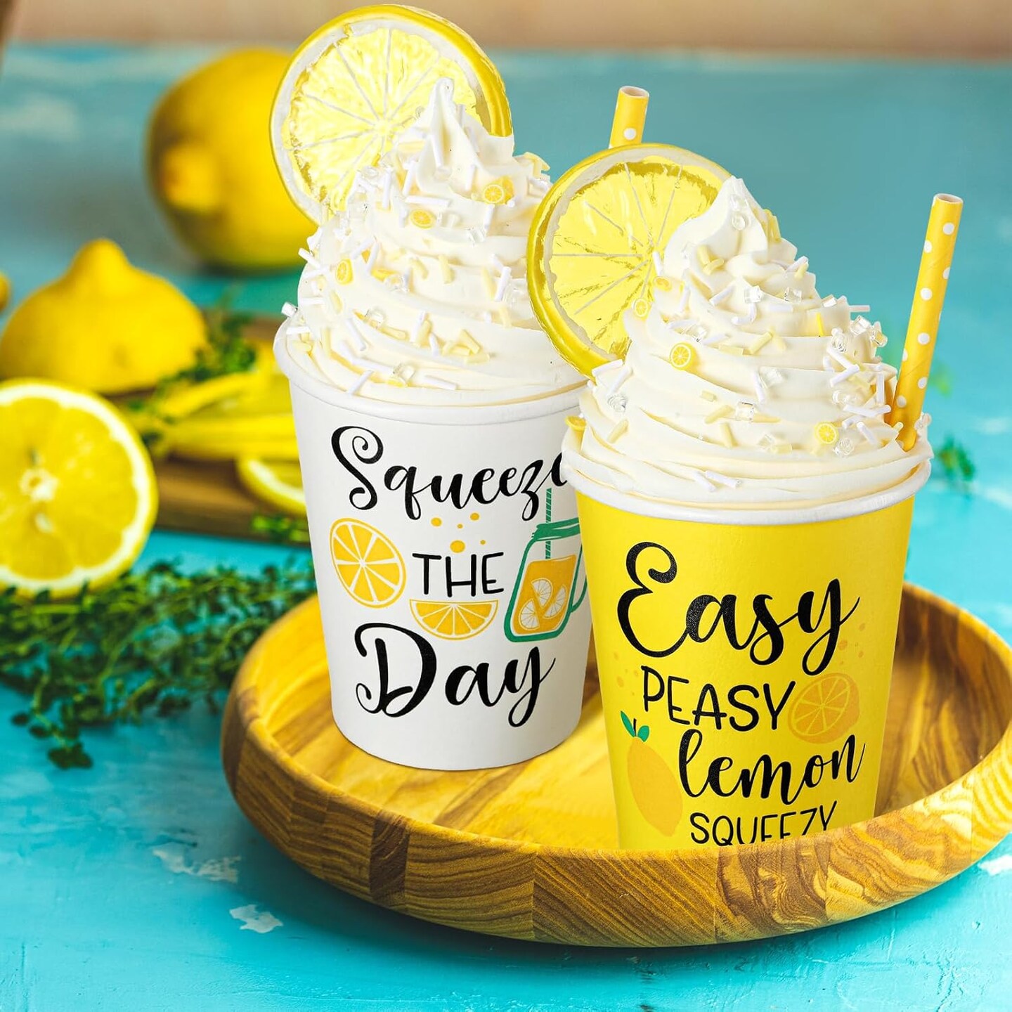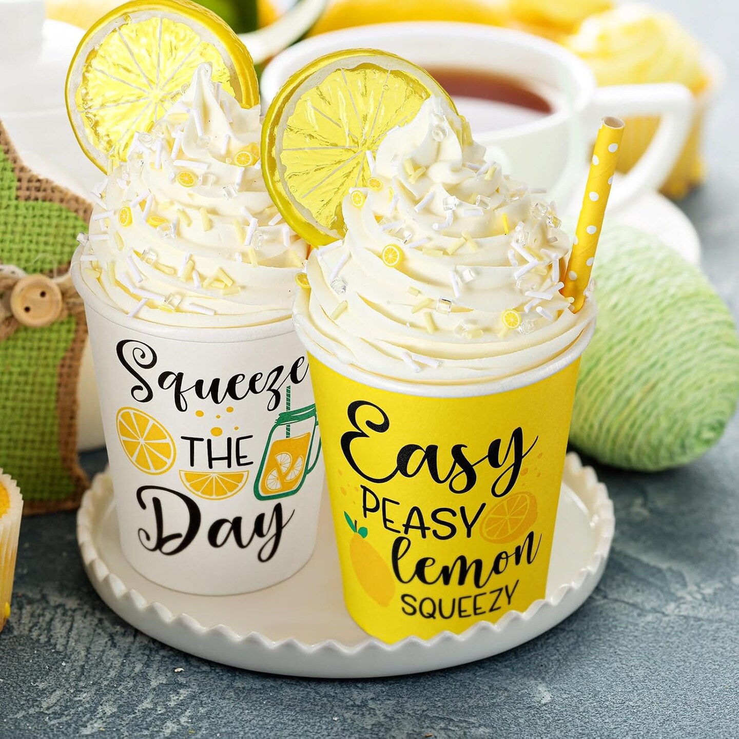 2 Pcs Summer Lemon Tiered Tray with Faux Whipped Cream Cups, Table Centerpiece, Kitchen Decor, Rustic Farmhouse Table Decor, Birthday Idea