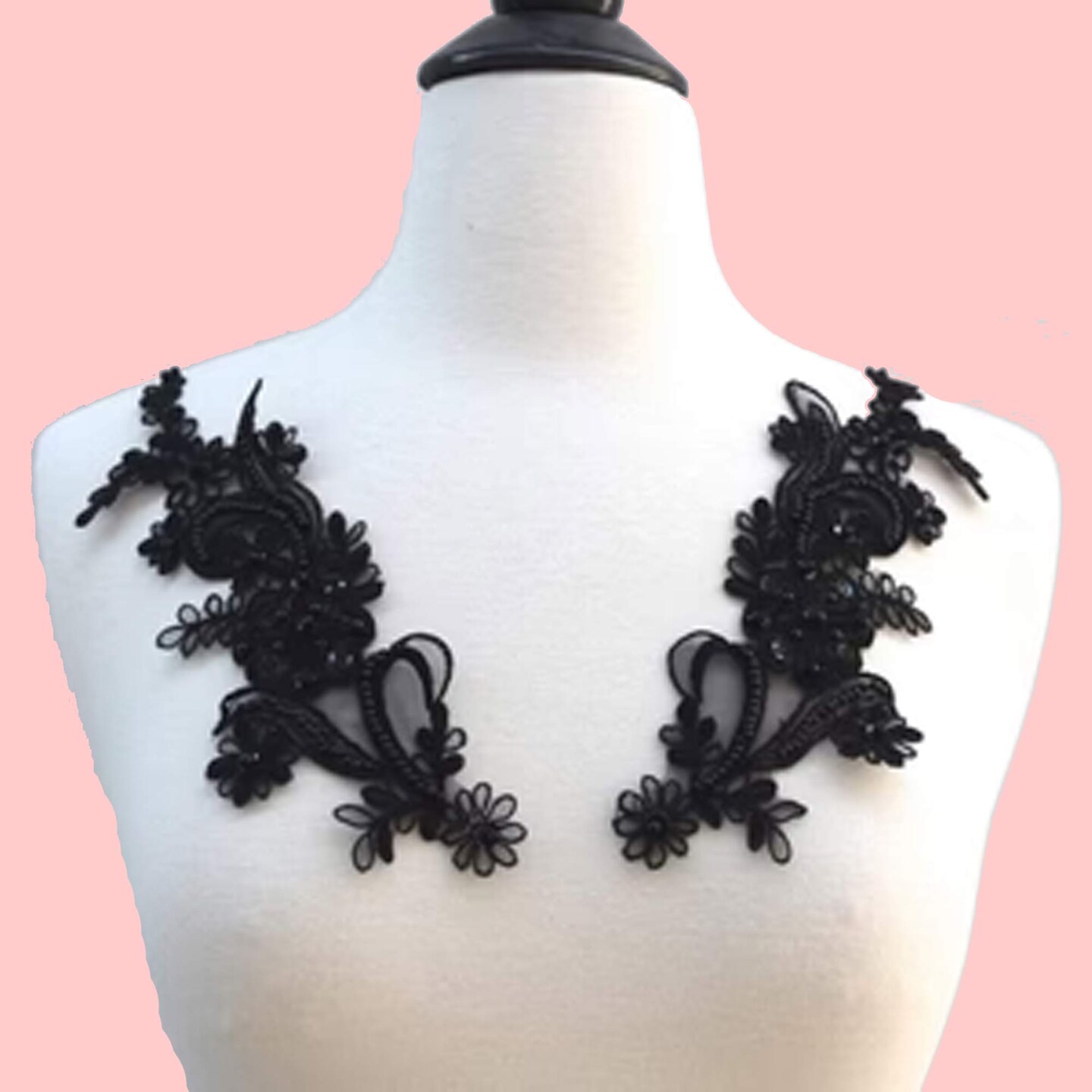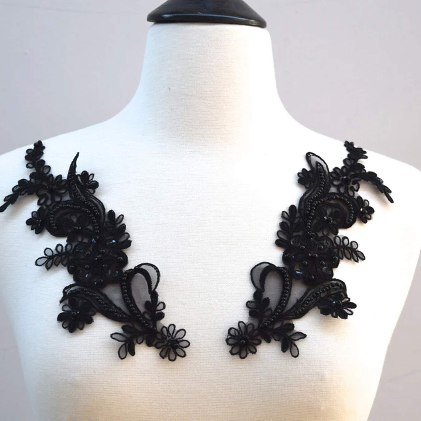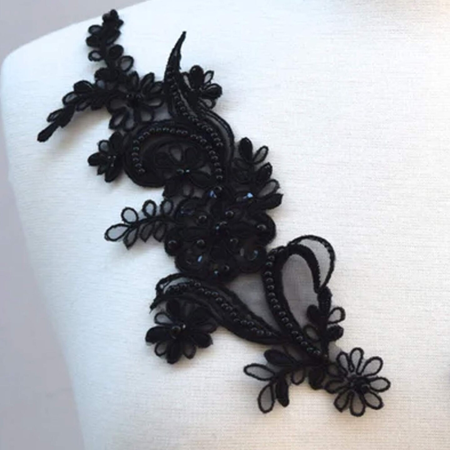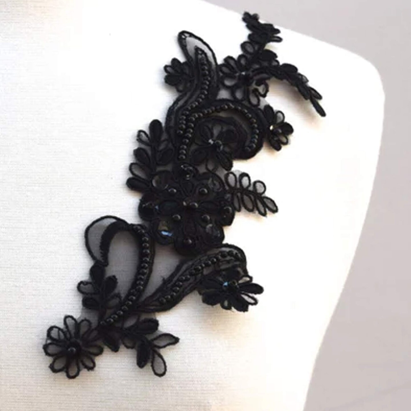 2 Piece Black Beaded Sequin Lace Applique 8.5x3.5 Inch Alencon Chiffon Set