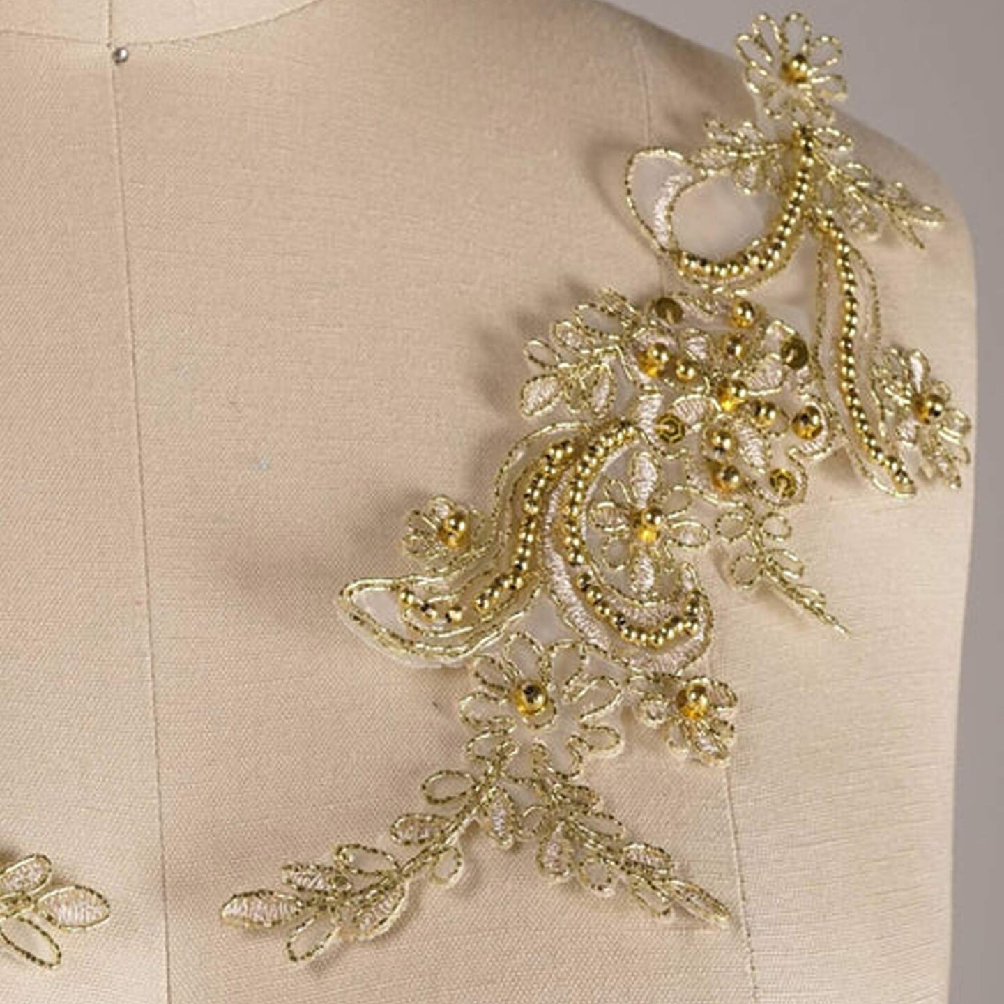 2 Piece Gold Beaded Lace Patch Applique 9 Inch Symmetrical Alencon for Costumes and Gowns