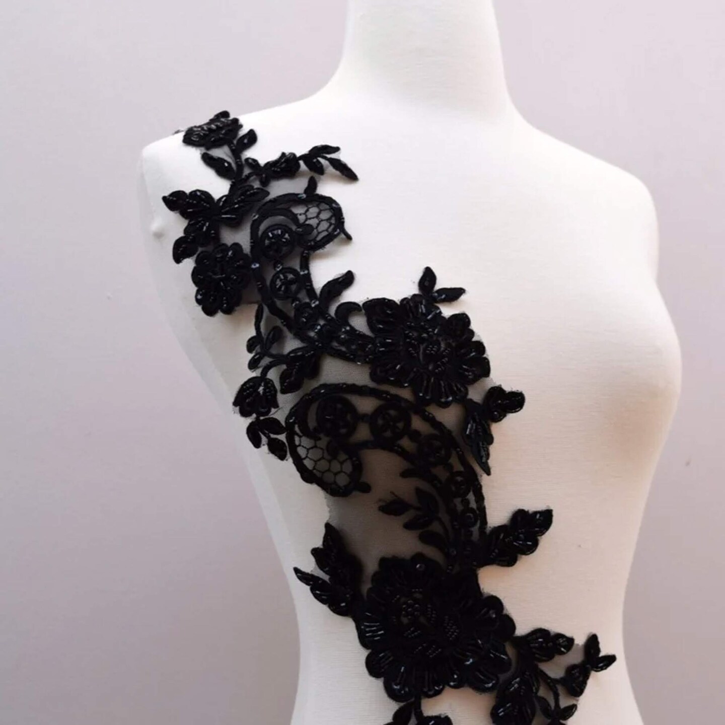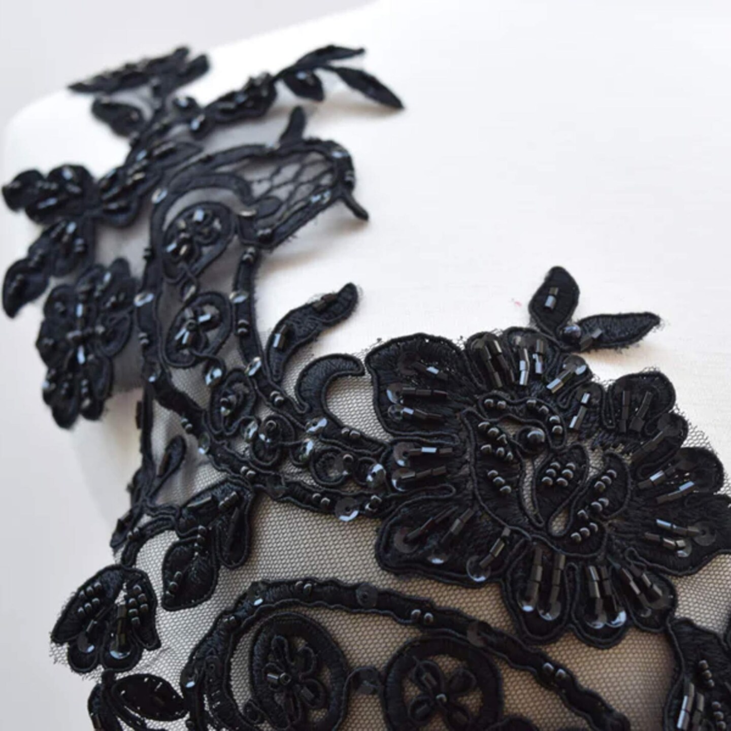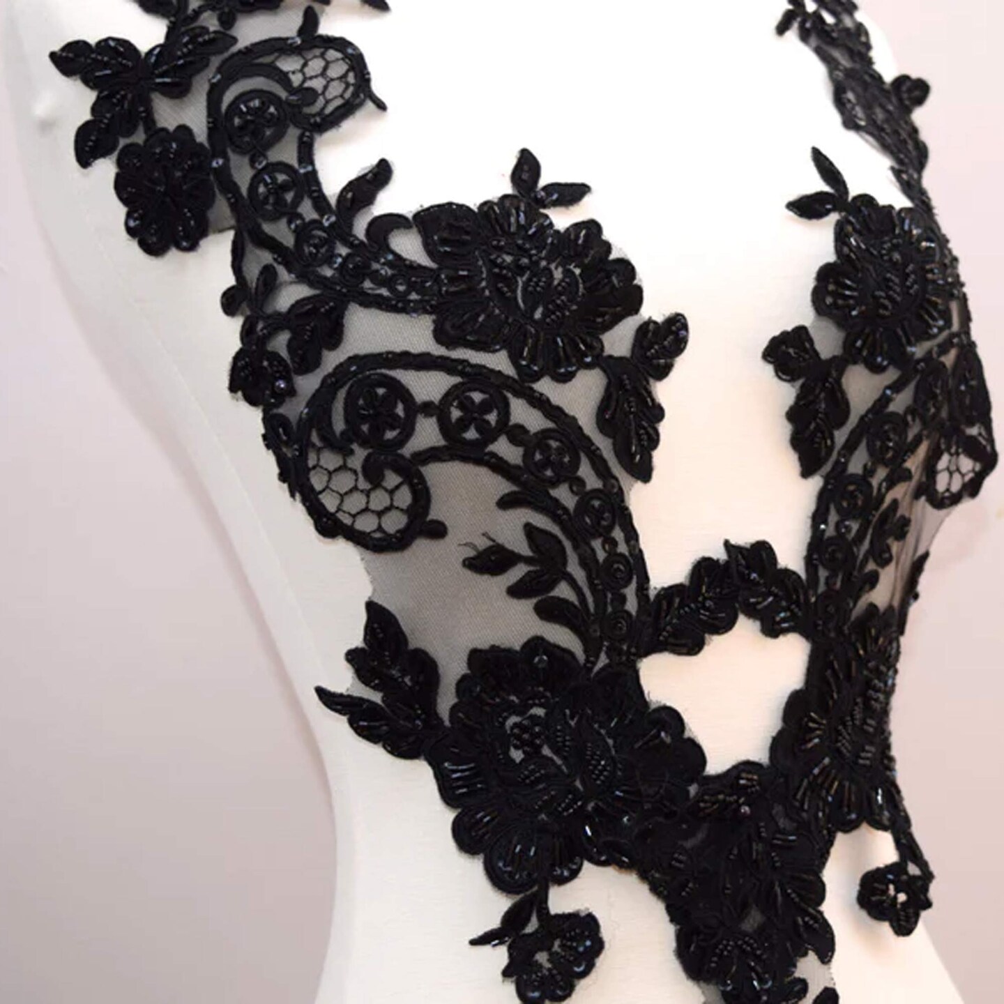 2 Pieces 21" x 6" Design Large Black Beaded Floral Applique Pair Extra Long