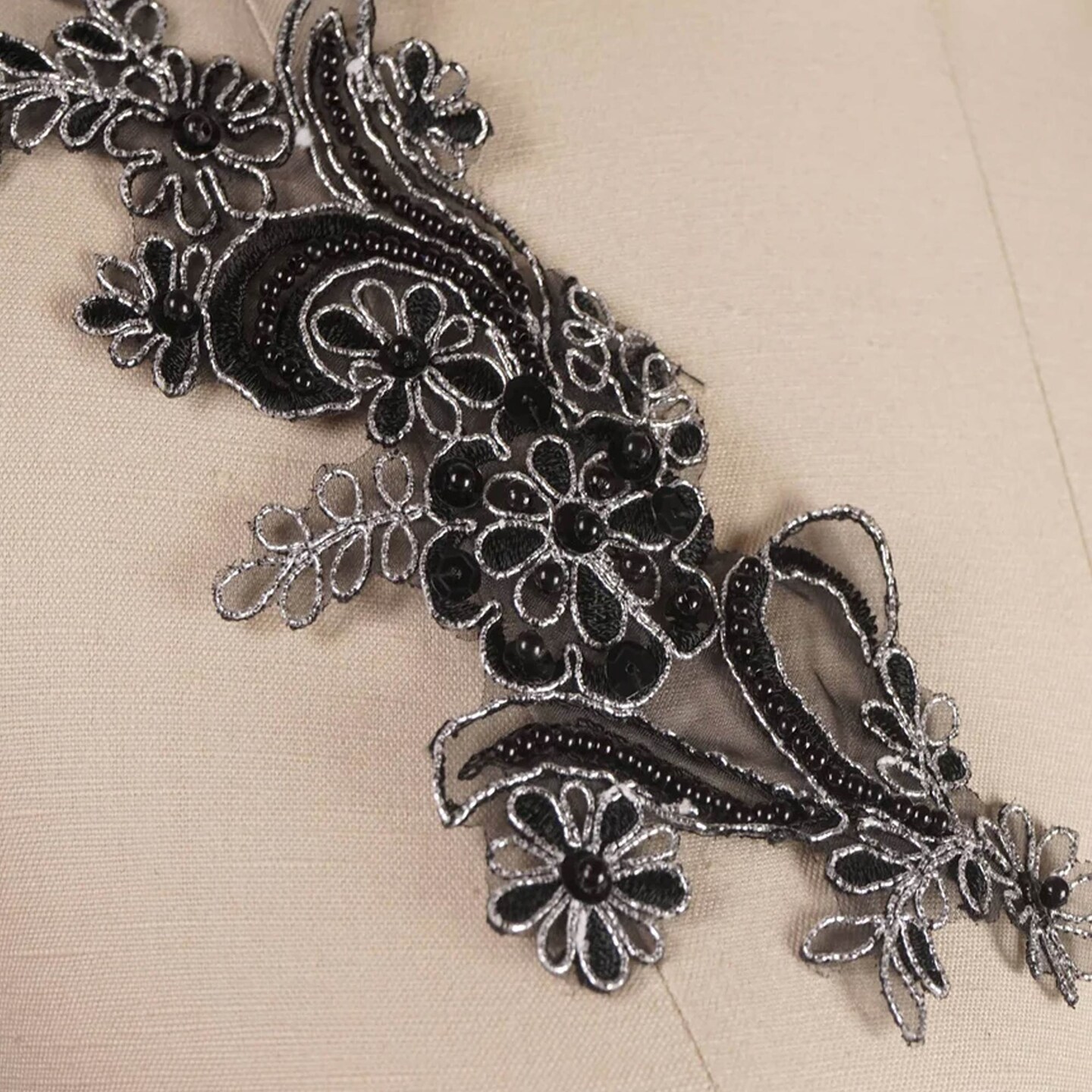 2 Pieces 8.5" x 3.5" Black Lace Metallic Silver Wire Applique Pair Vibrant Coral Color