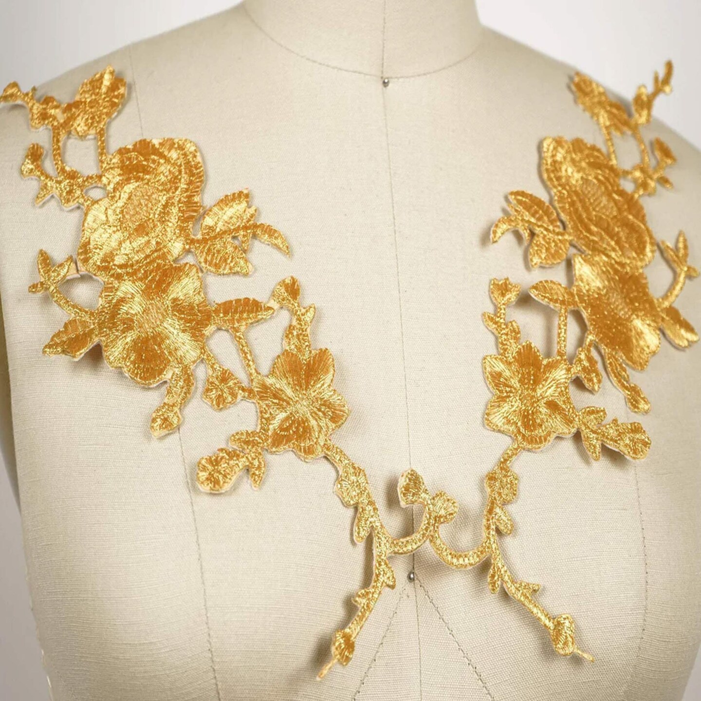 2 Pieces 9.75" x 4.75" Gold Floral Appliques Metallic Embroidered Iron-On Patch Pair for Dresses, Jackets & DIY Crafts