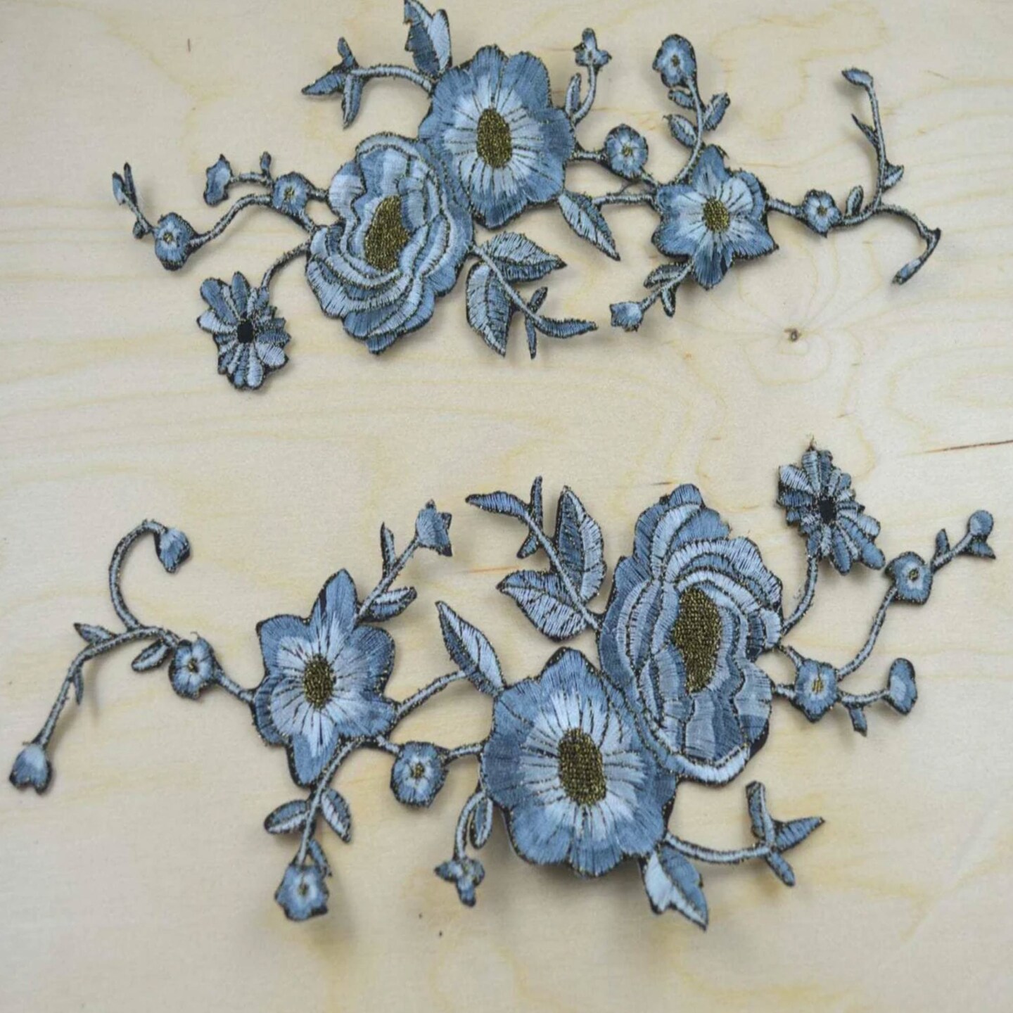 2 Pieces Large Pale Blue Flower Embroidery Patch with Antique Gold Detailing and Iron On Backing