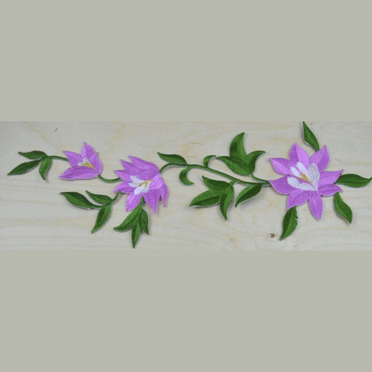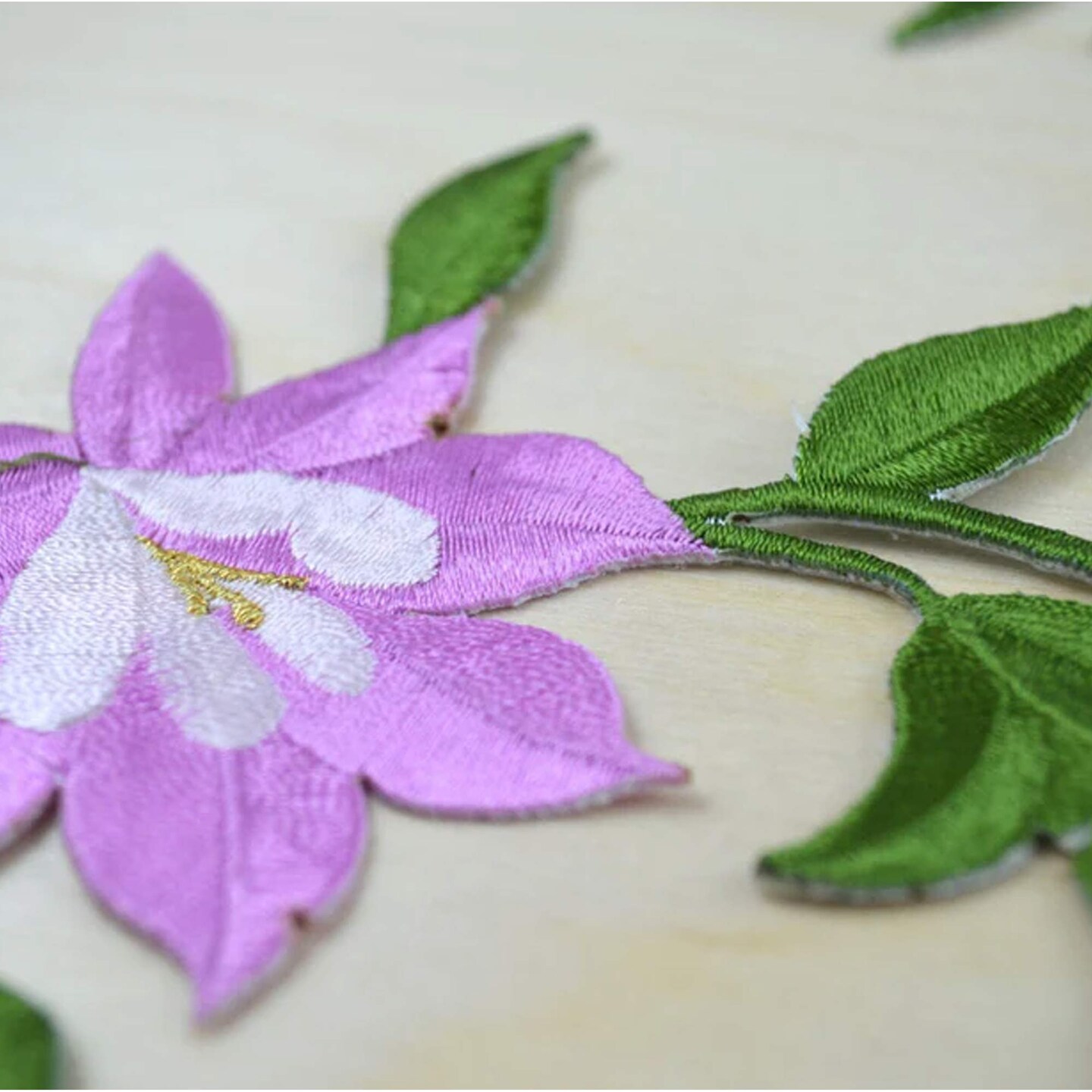 2 Pieces Lavender Lily Flower Appliques Embroidered with Green Vines & Iron-On Backing for DIY Crafts & Clothing