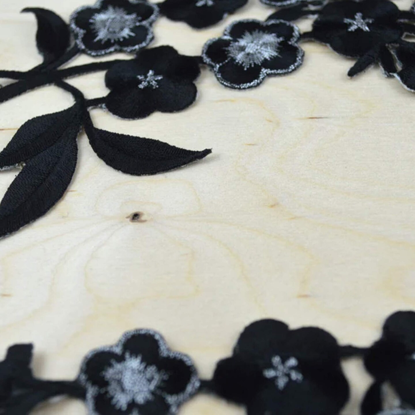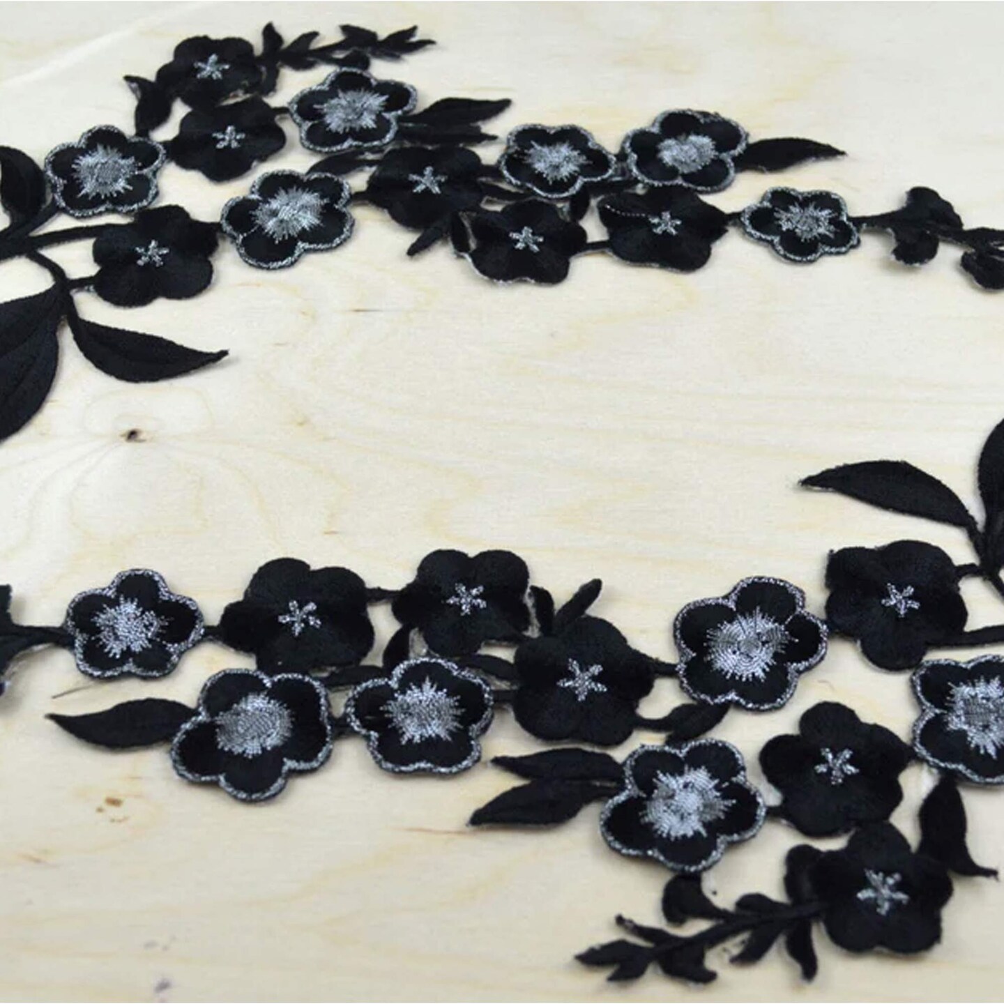 2 Pieces mirrored pair Black Silver Floral Appliqué 10.75x3" Iron On Embroidery Patches for Jackets & Crafts