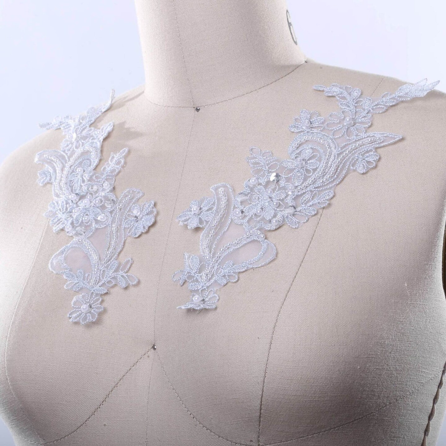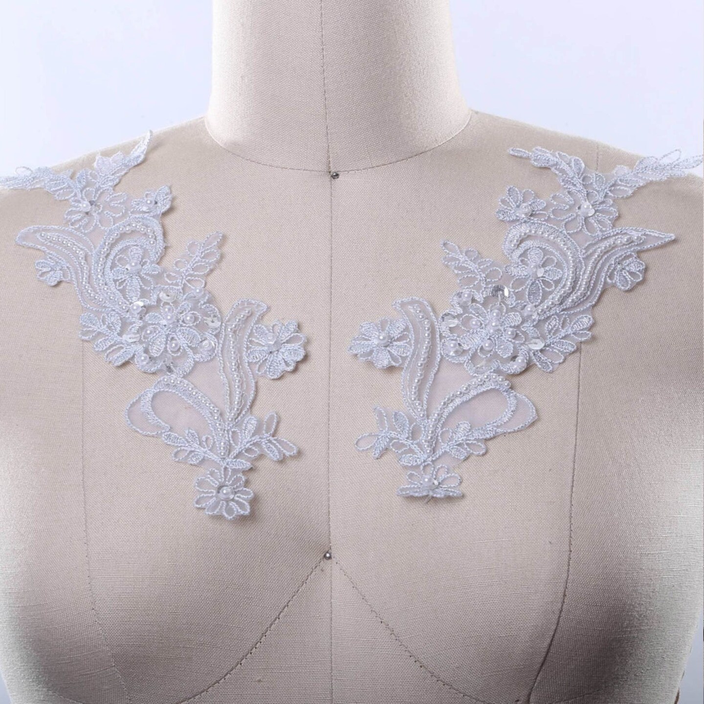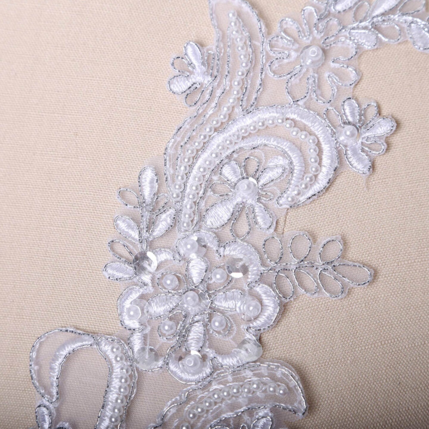 2 Pieces Shimmery Silver Lace Appliques with Pearl and Sequin Detailing for Costumes and Gowns