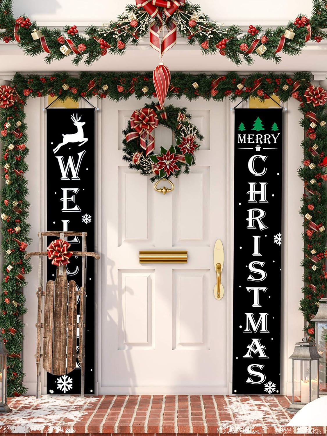 2 Pieces Welcome Christmas Banners Christmas Hanging Porch Sign(Black)72"L x 12"W