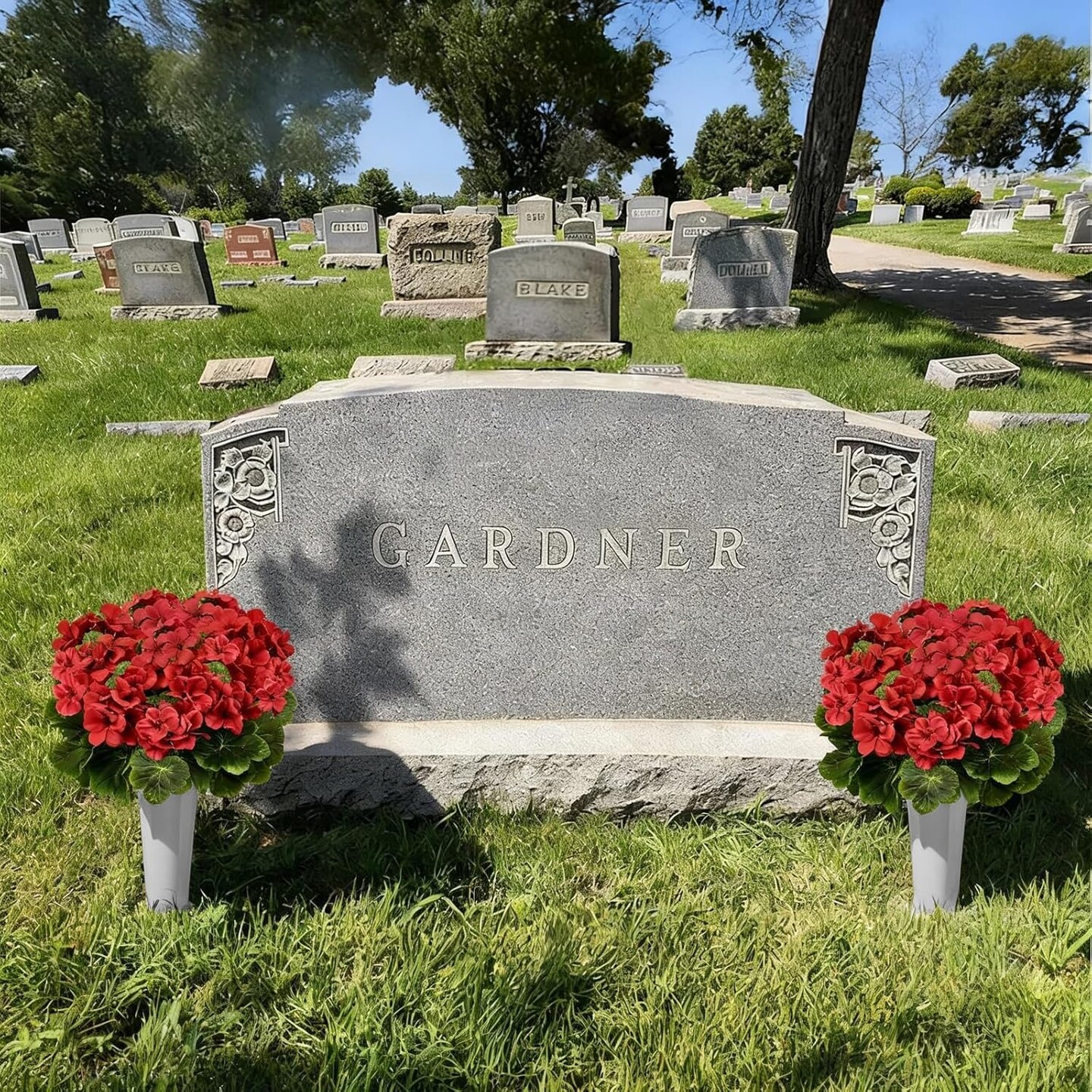 2 Sets Artificial Cemetery Flowers for Grave – Silk Geranium Bouquets with Grave Vase, 17" Red Memorial Flowers for Cemetery Gravesite Decorations