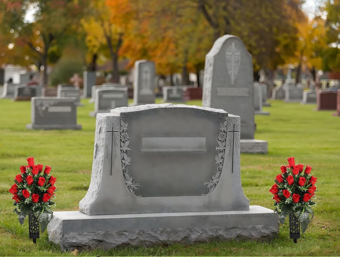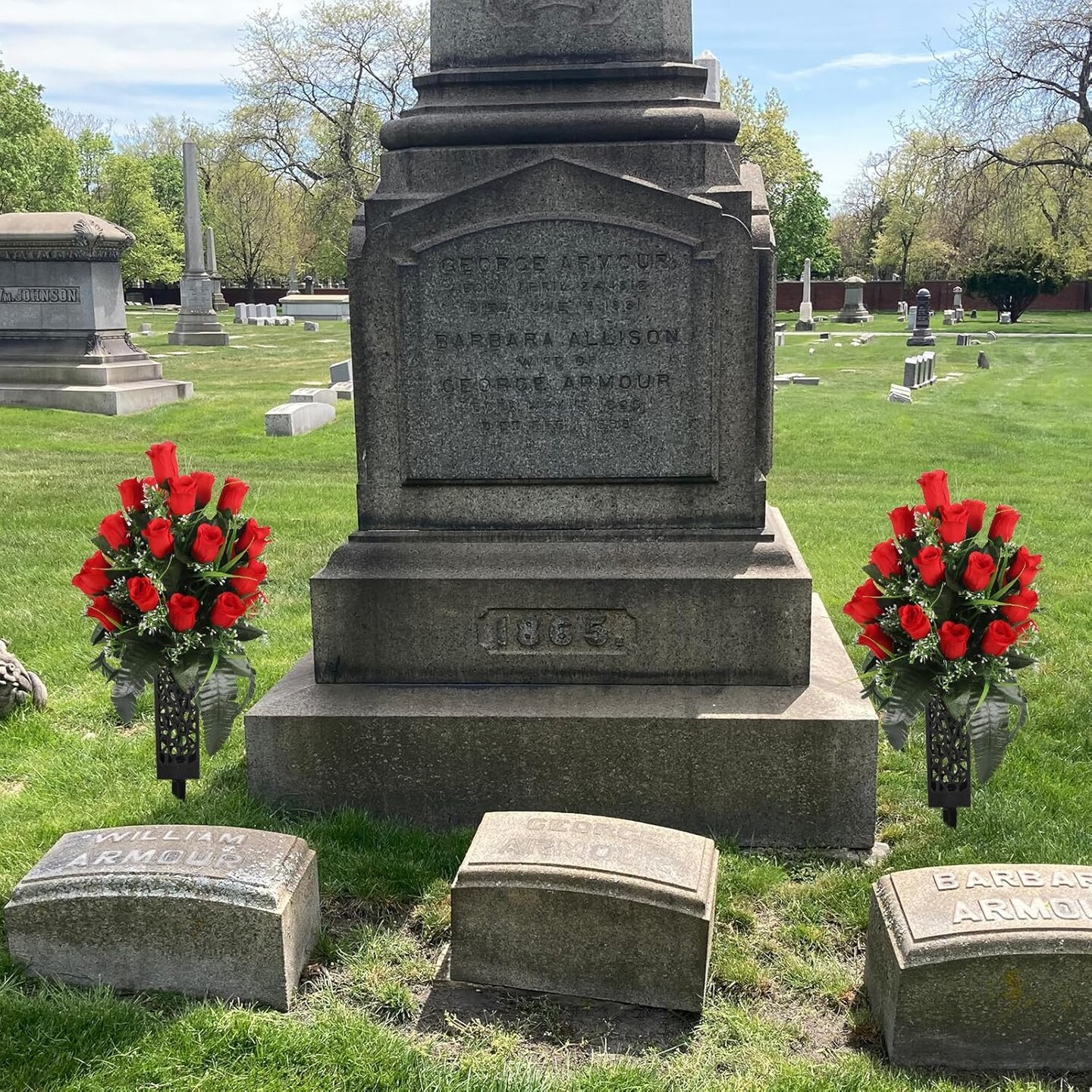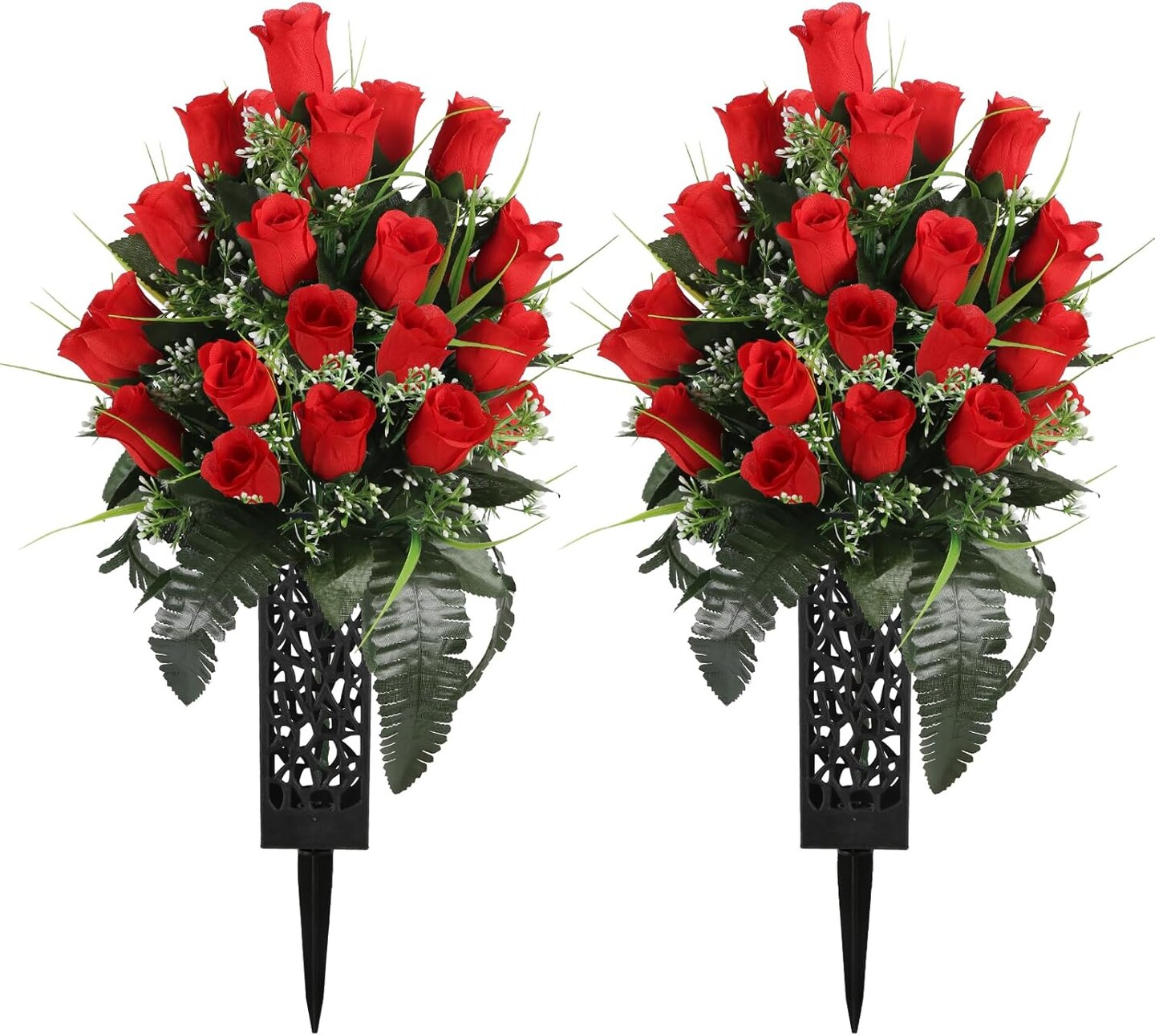 2 Sets Artificial Cemetery Flowers with Vase – Red Silk Grave Flowers, Memorial Gravesite Decorations, Long-Lasting Non-Bleed Colors