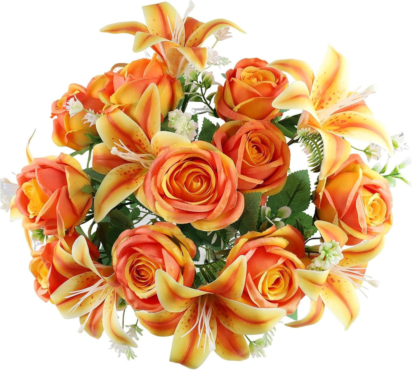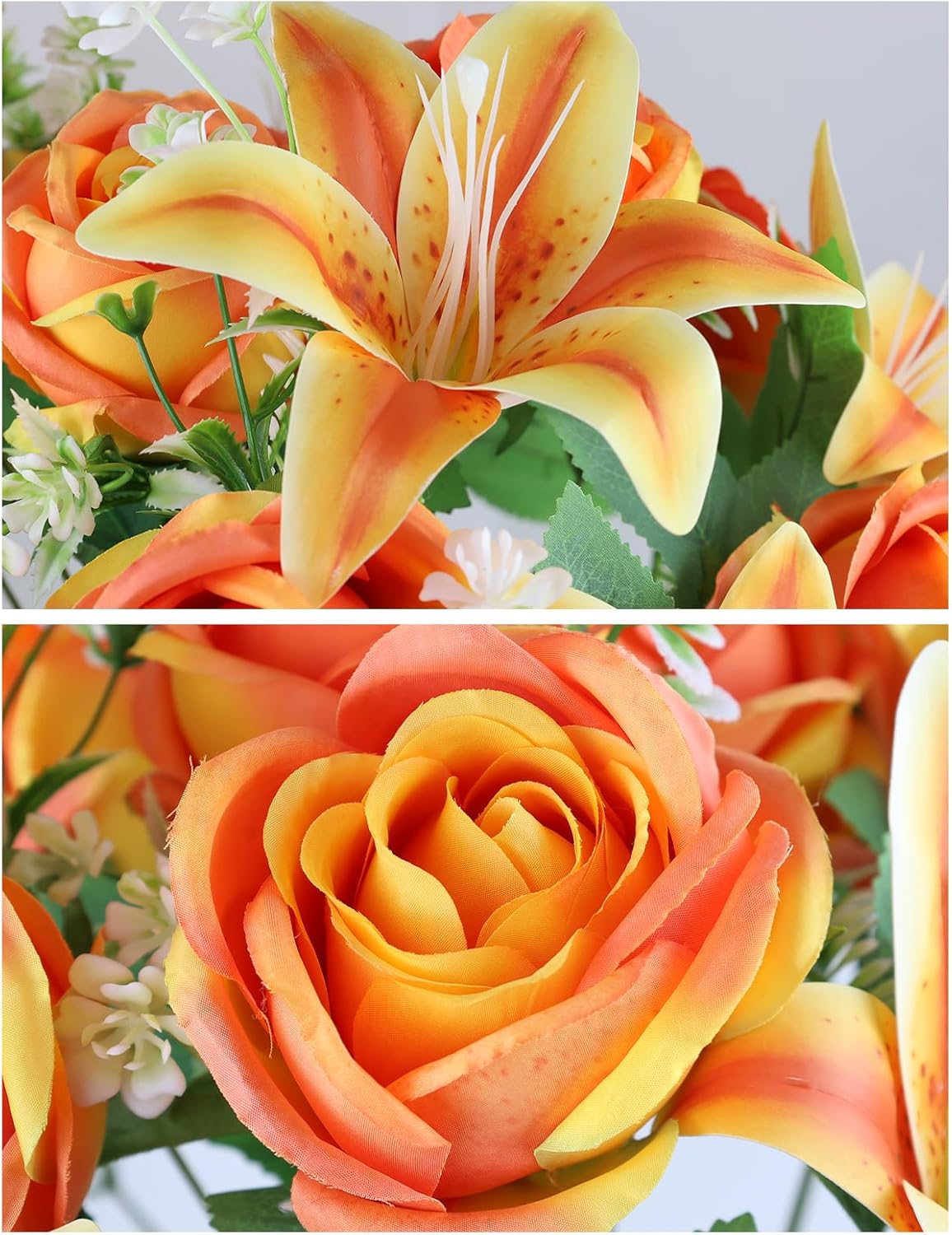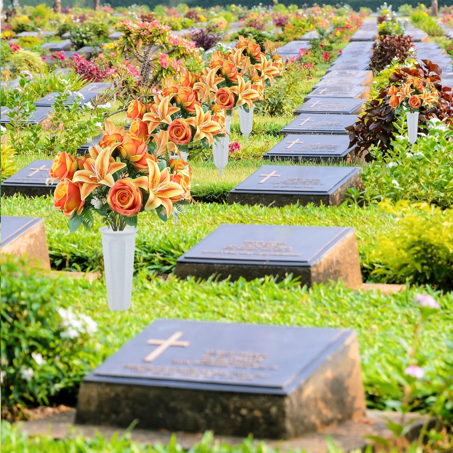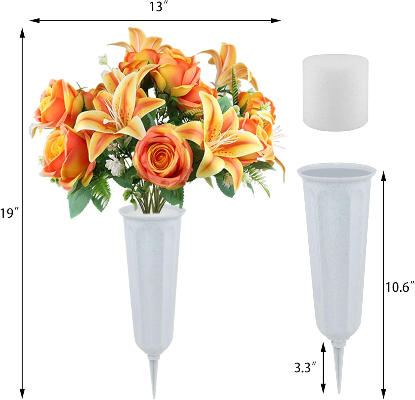 2 Sets Artificial Cemetery Flowers with Vases – Mixed Lilies & Roses (Orange & Yellow), 2 Grave Vases with Foam for Outdoor Headstones, Gravesites, and Memorial Decorations