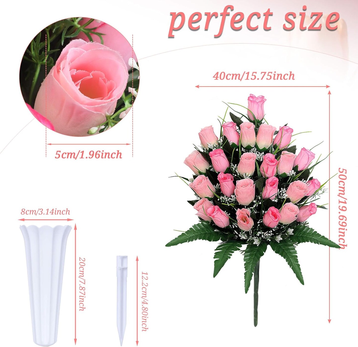 2 Sets Artificial Cemetery Flowers with Vases – Pink Memorial Rose Bouquets for Outdoor Grave Decorations