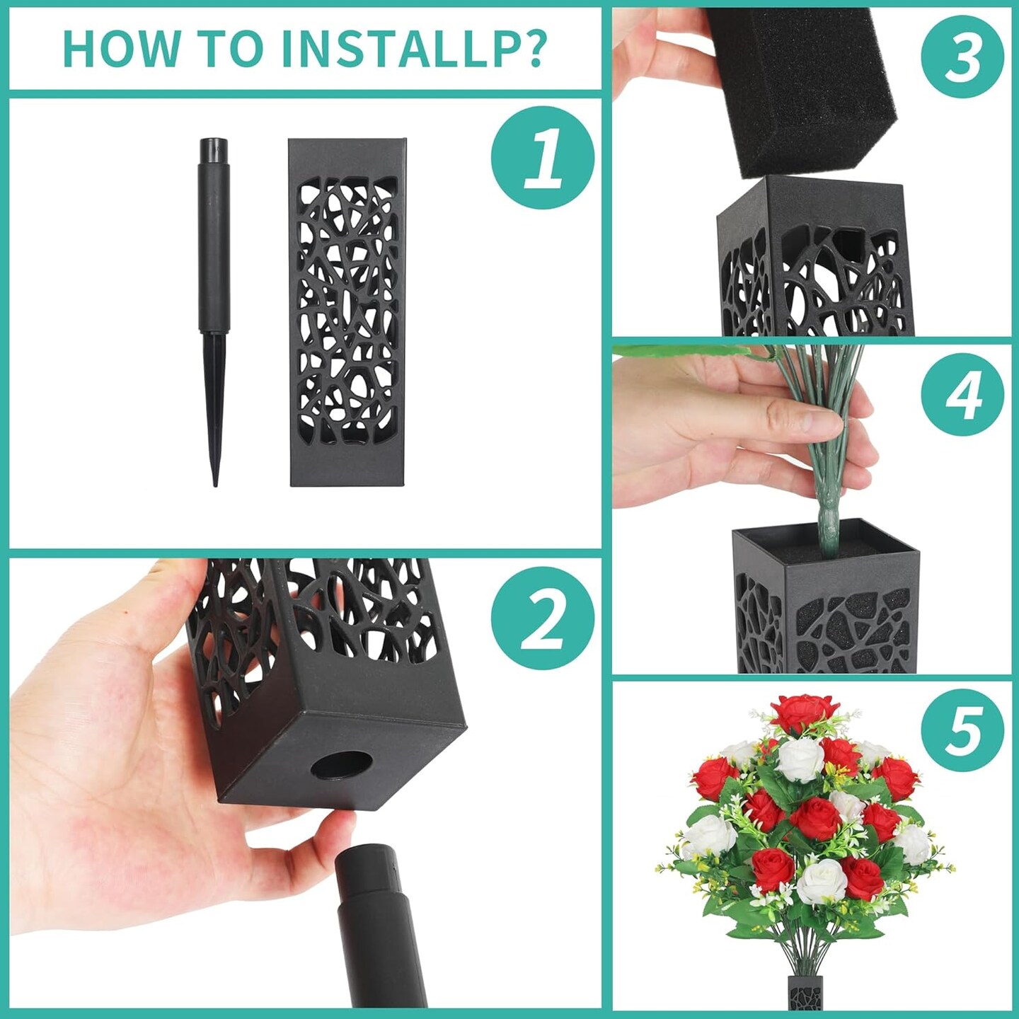 2 Sets Artificial Cemetery Flowers,Artificial Cemetery Flowers with Vase,Memorial Flowers,Artificial Rose Bouquet Graveyard Memorial Flowers for Graveyard Headstones Decoration(Red and White