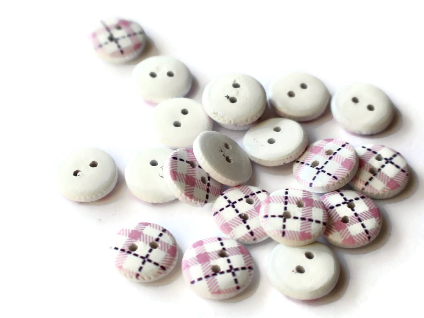 20 13mm Two Hole Pink Tartan Plaid Round Buttons Wooden Buttons White Wood Buttons