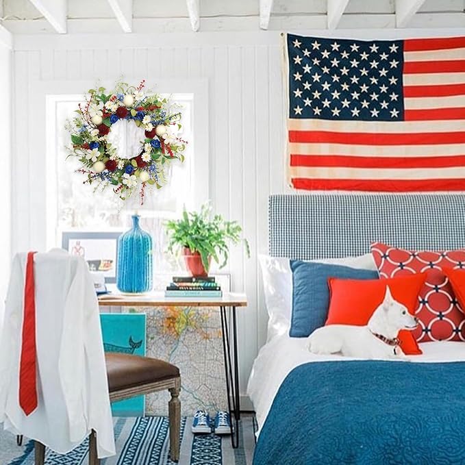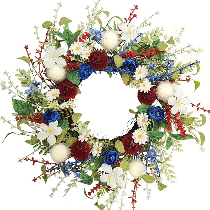 20 Inch 4th of July Patriotic Day Wreath Artificial Floral Wreath for Front Door Red Blue White Flower Patriotic Decorations for Memorial Day Independence Day Veterans Day