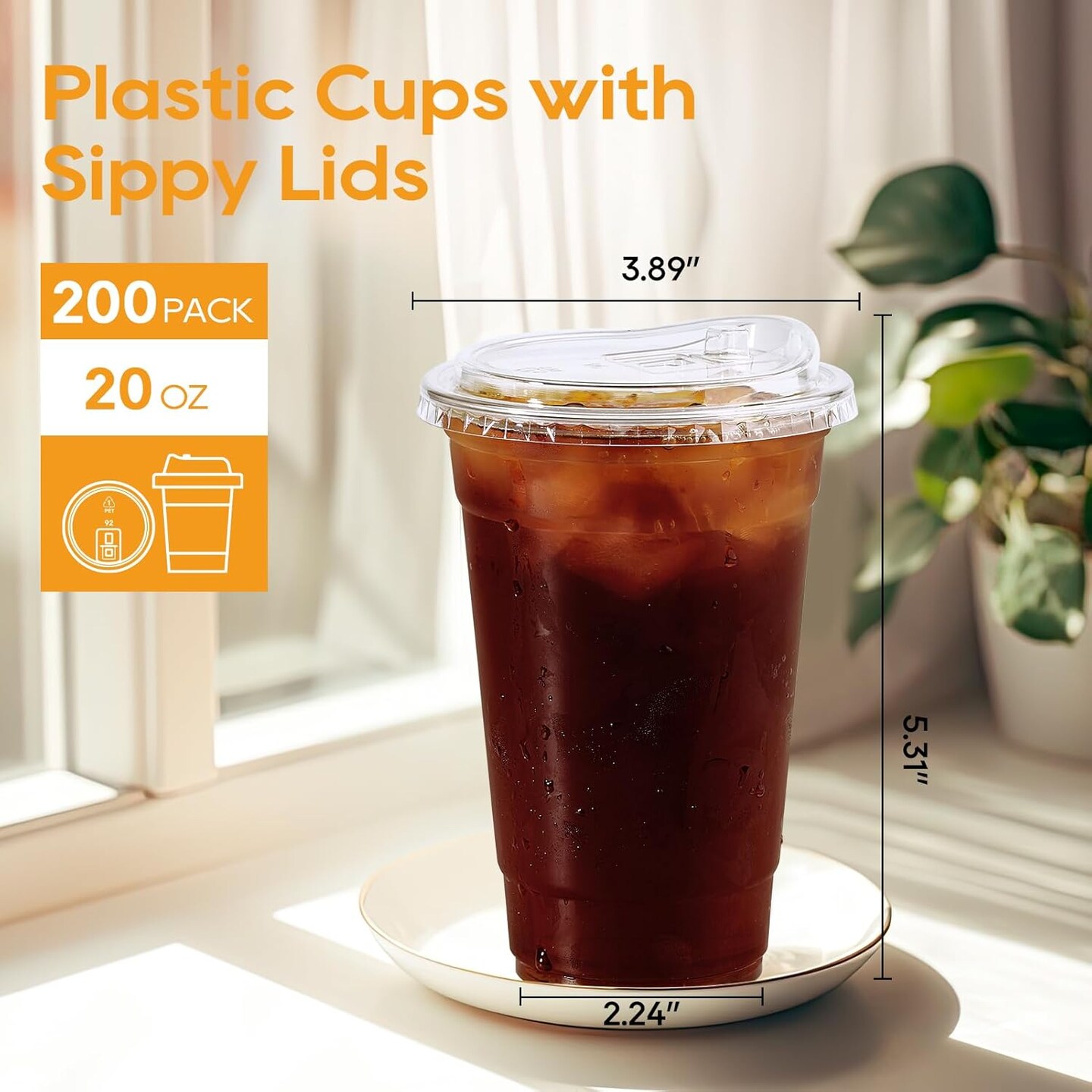 20 OZ 200 Sets Clear Plastic Cups with Strawless Sip Lids, To Go Crystal Clear Disposable Plastic Cups with Lids for Iced Coffee, Smoothies, Soda, Lemonade, Cold Beverage