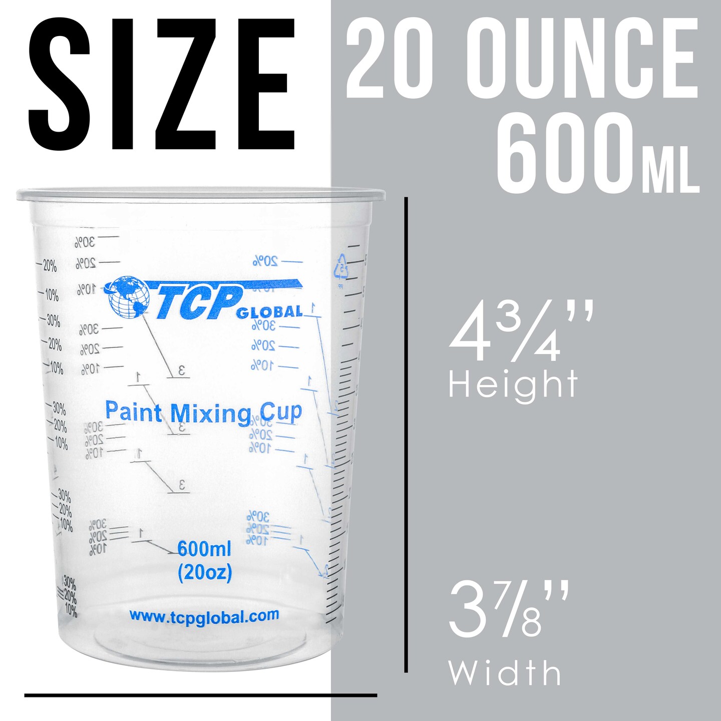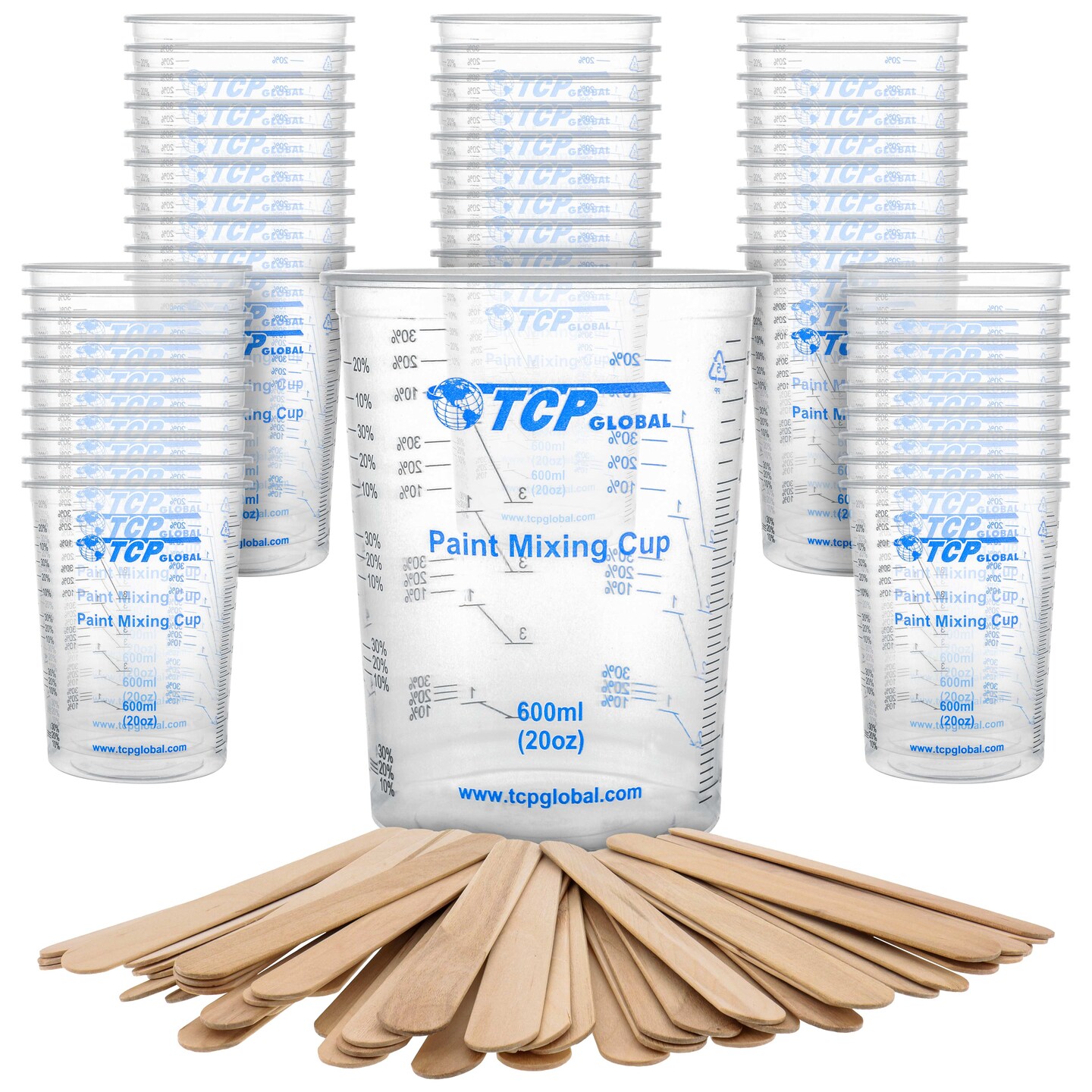 20 oz. (600ml) Graduated Plastic Mixing Cups - Box of 50 with 50 Mixing Sticks - Disposable Plastic Measuring Cups for Liquids, Paints, Resin, Epoxy, Art, Kitchen - Ratios 2-1, 3-1, 4-1 ML
