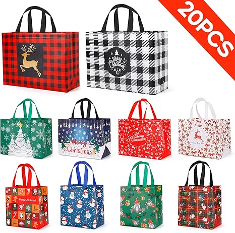 20 Pack Christmas Gift Bags Assorted Sizes, Reusable Tote Bags with Handle, Includes 4 Large 8 Medium 8 Small Non-Woven Christmas Bags for Xmas Party Favors