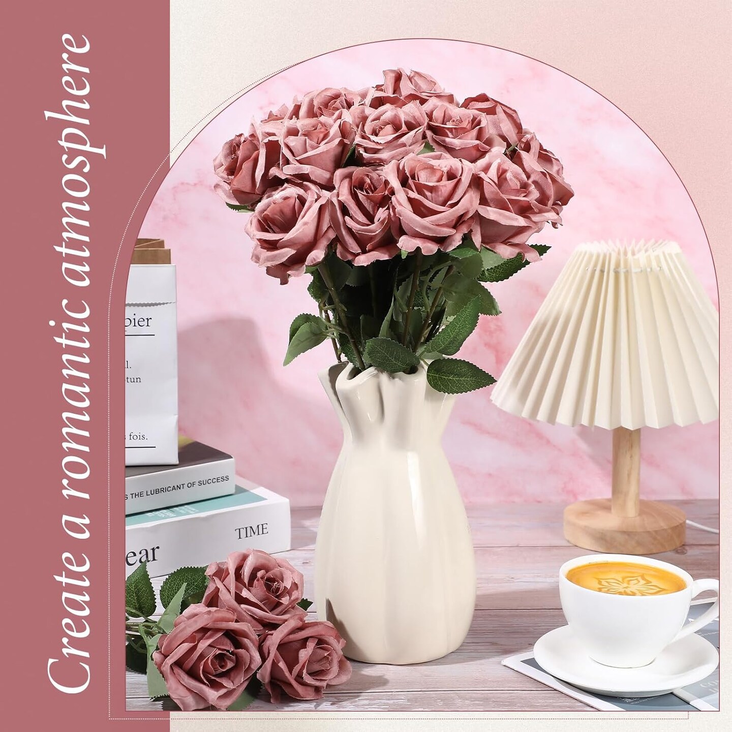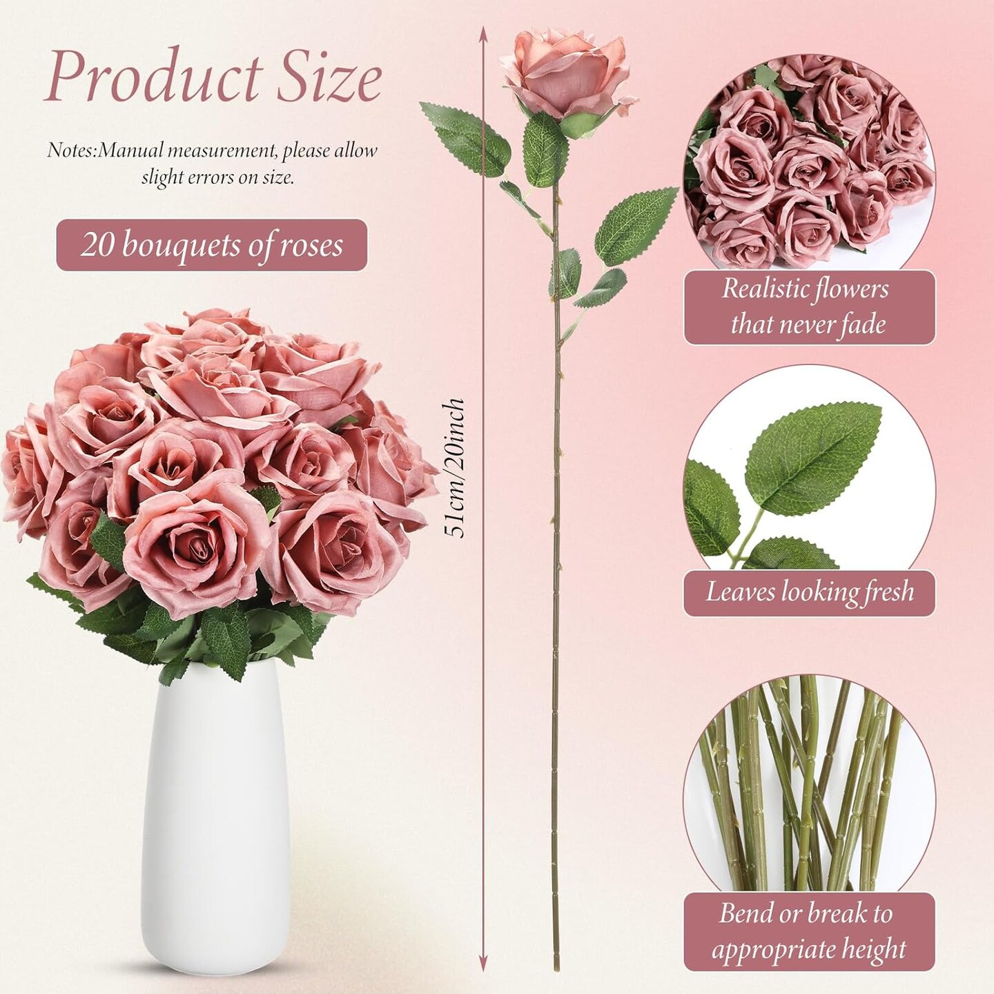 20 Pcs Artificial Dusty Rose Flowers with Long Stems – Real Touch Silk & Plastic Bouquet for Home Decor, Bridal, Wedding, Party, and Table Centerpieces