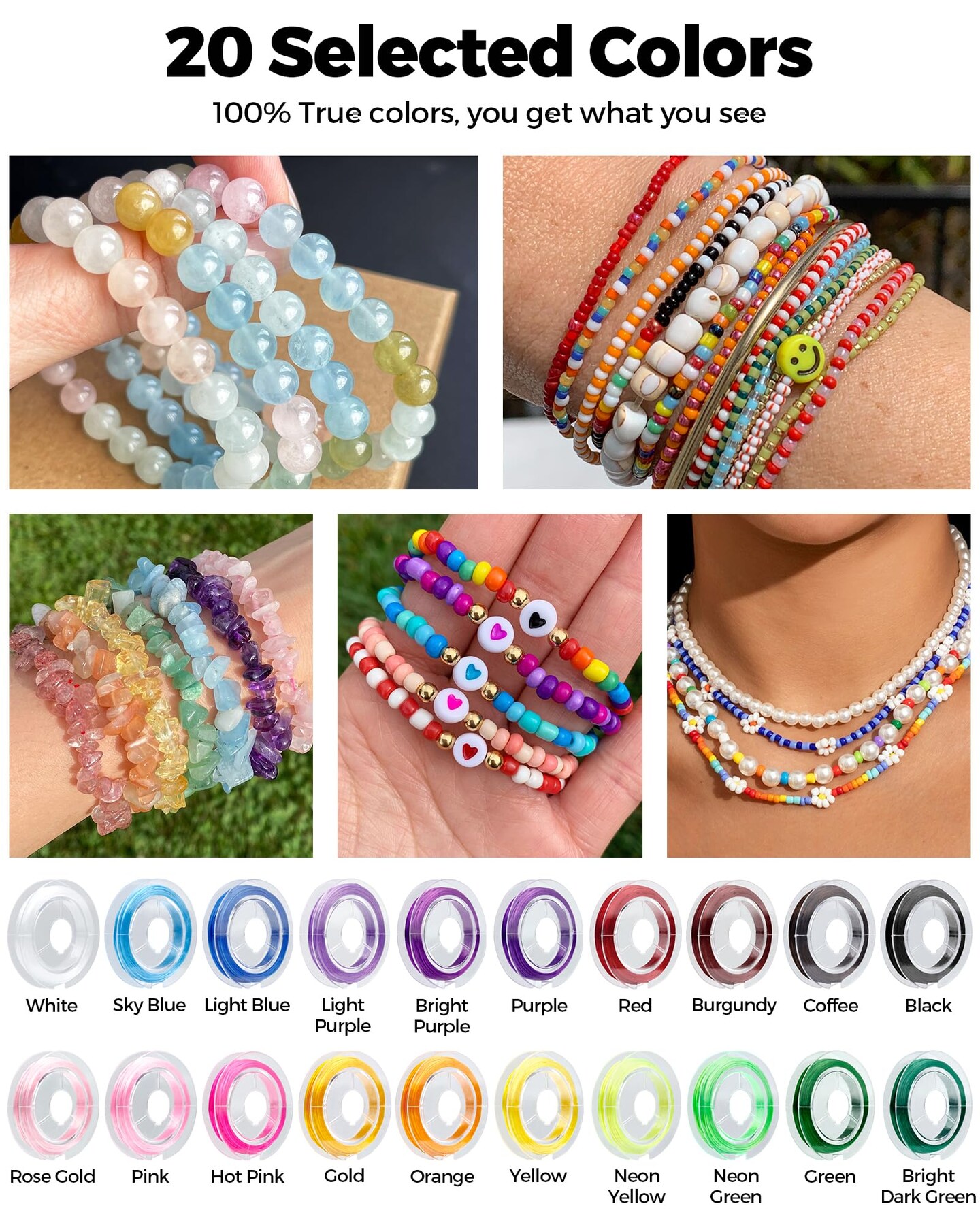 20 Roll FIVEIZERO 0.7mm Flat Elastic Bracelet String Cord, 20 Color High Stretch Beading Elastic String for Bracelets Necklace Jewelry Making, Stretchy Thread Cord for Clay Beads, Crystal & Pony Beads