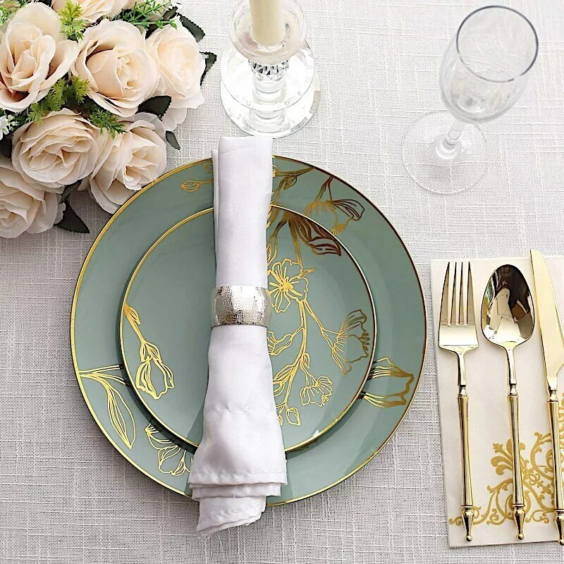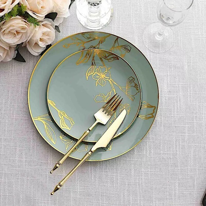 20 Round DUSTY SAGE Plastic Salad Dinner PLATES Gold Floral Design