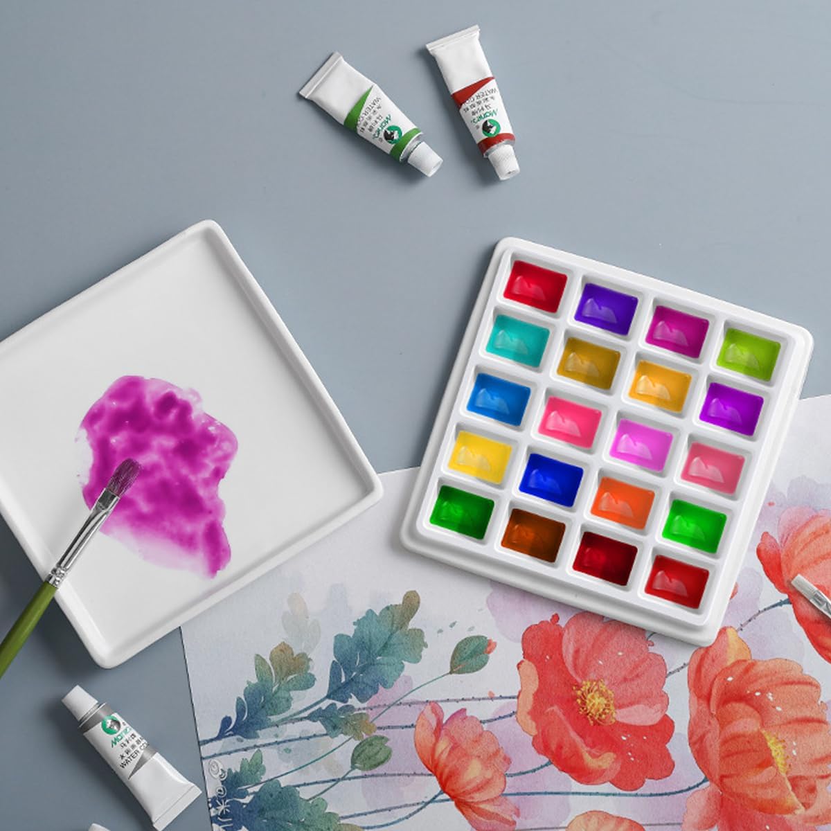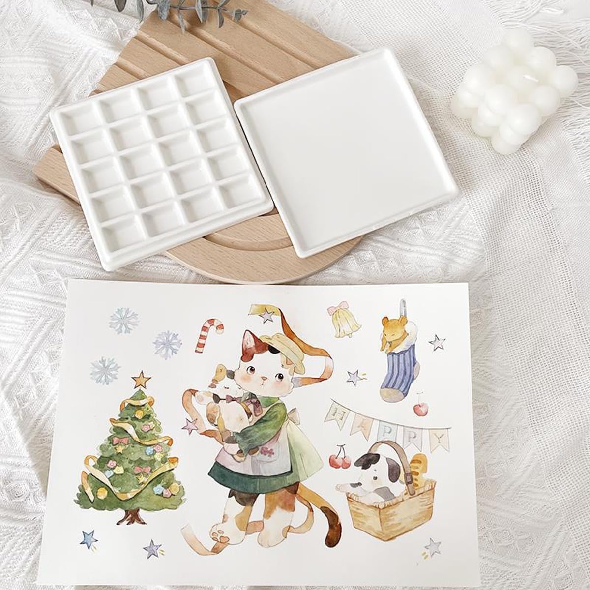 20 Wells Porcelain Paint Palette with Cover Ceramic Palette Mixing Tray for Painting Watercolor Gouache Color Mixing Painting Palette Hobby and Crafts