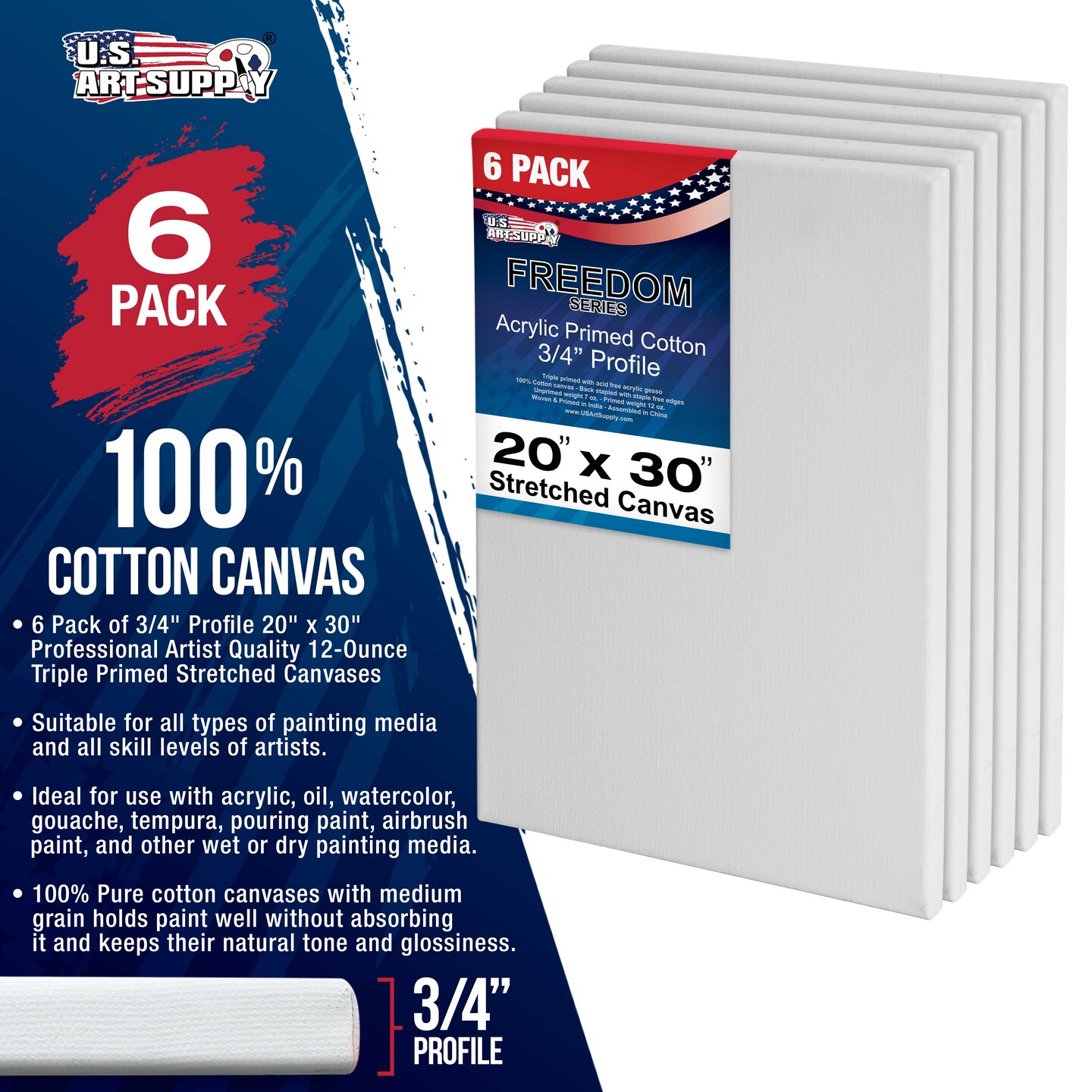 20 x 30 inch Stretched Canvas 12-Ounce Triple Primed, 6-Pack - Professional Artist Quality White Blank 3/4" Profile, 100% Cotton, Heavy-Weight Gesso