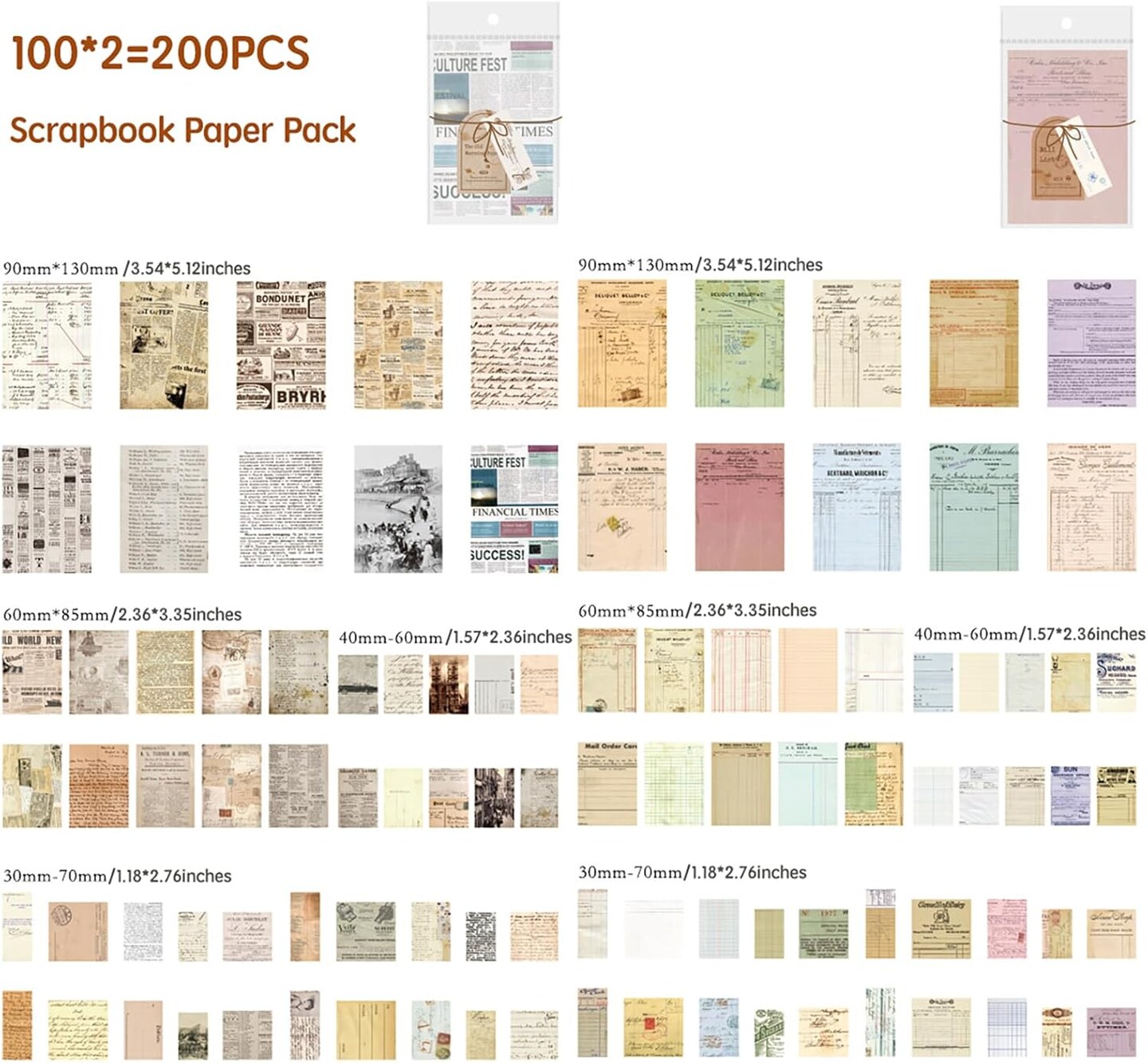 200 Sheets Vintage Scrapbook Paper Packs 1.18 x 5.12 inches