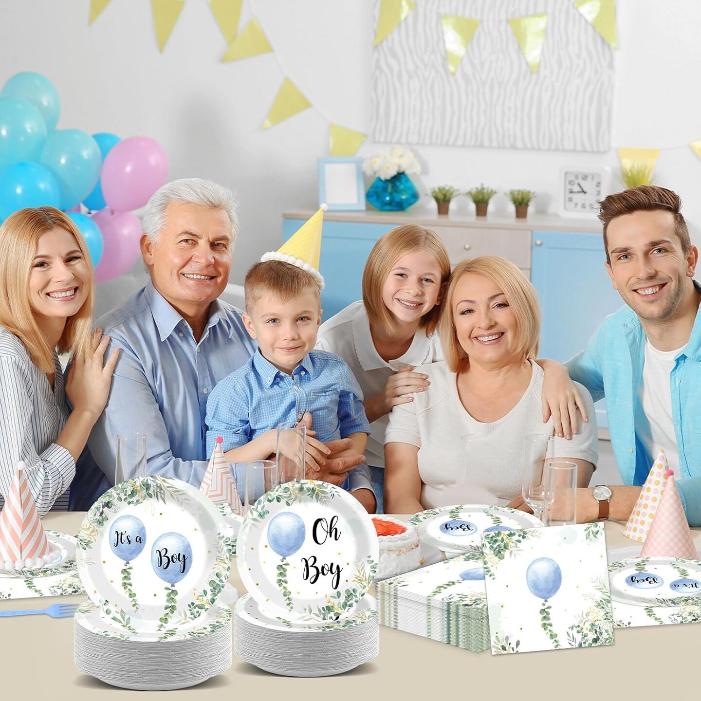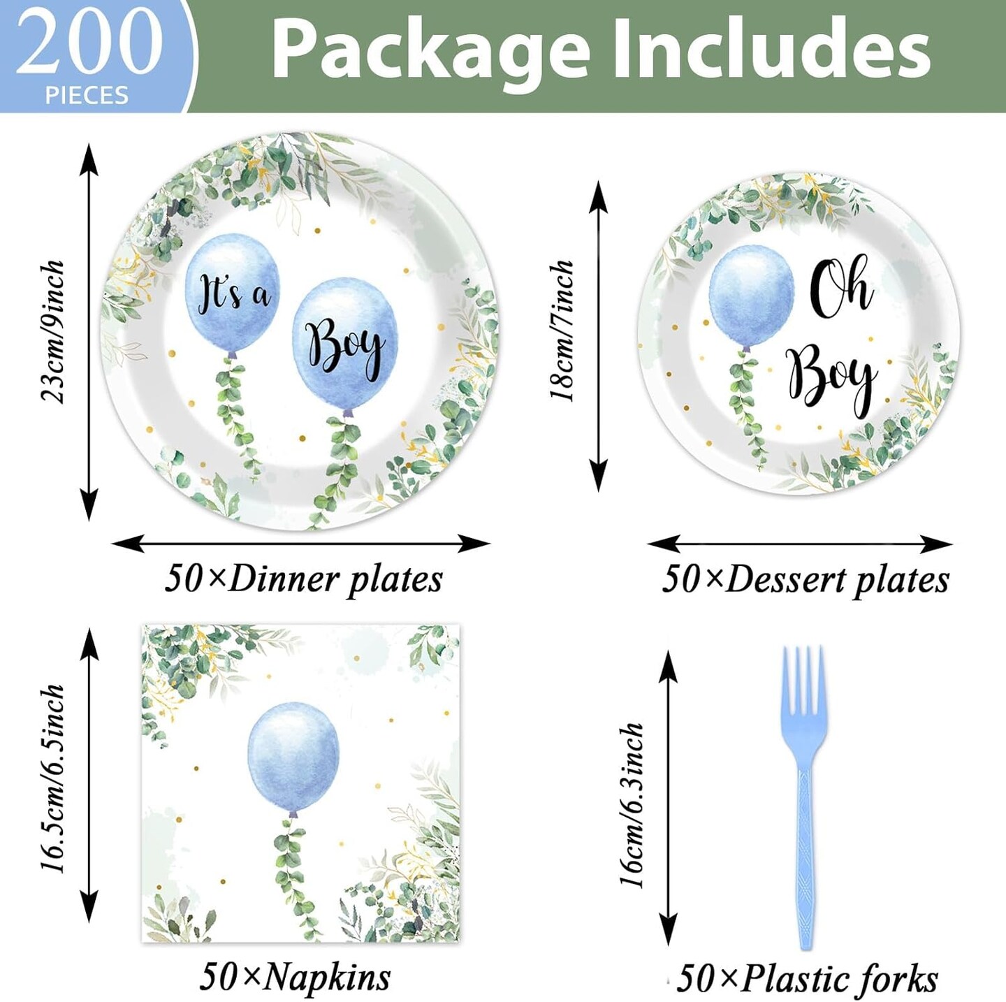 200-Piece Oh Boy Blue Balloon & Eucalyptus Baby Shower Tableware Set