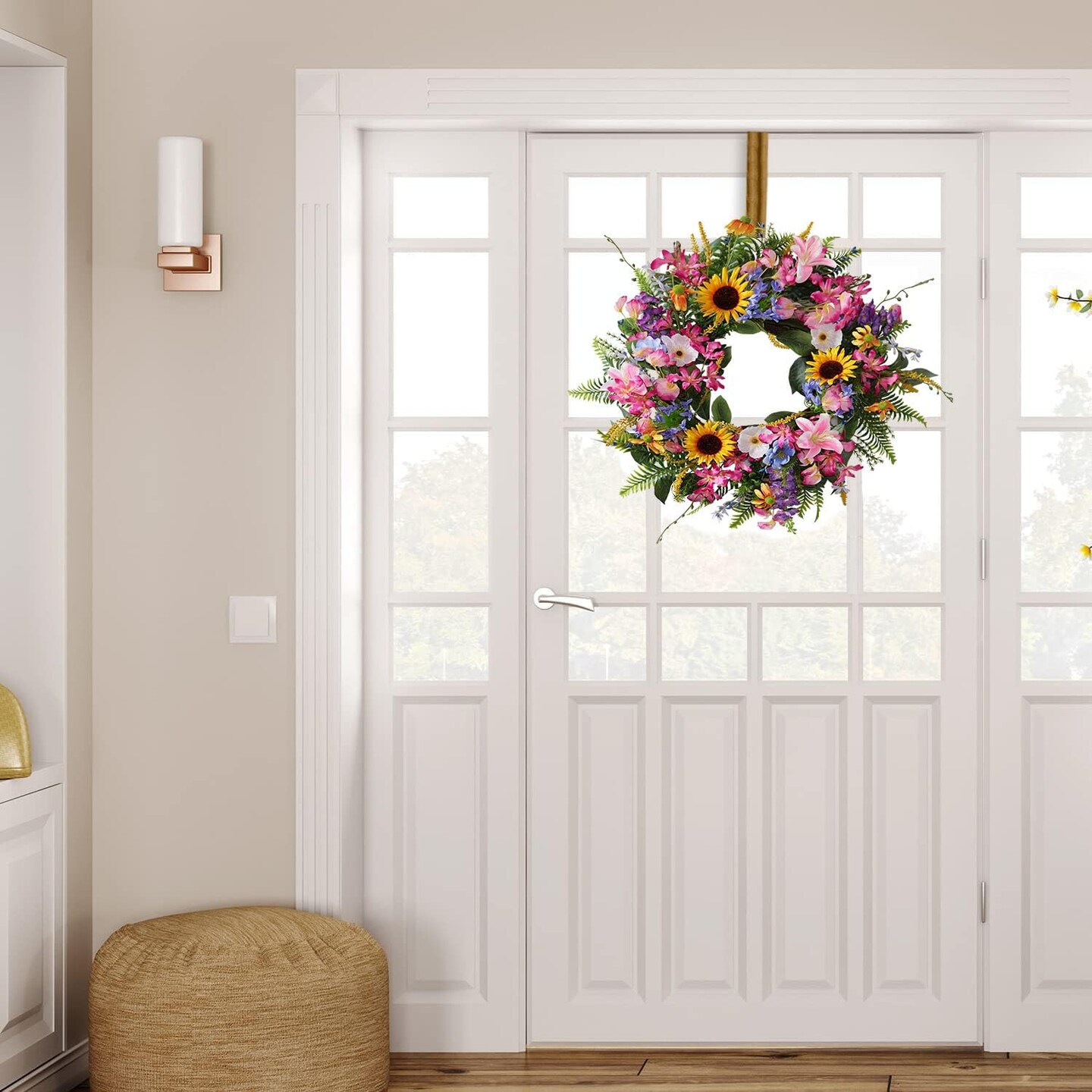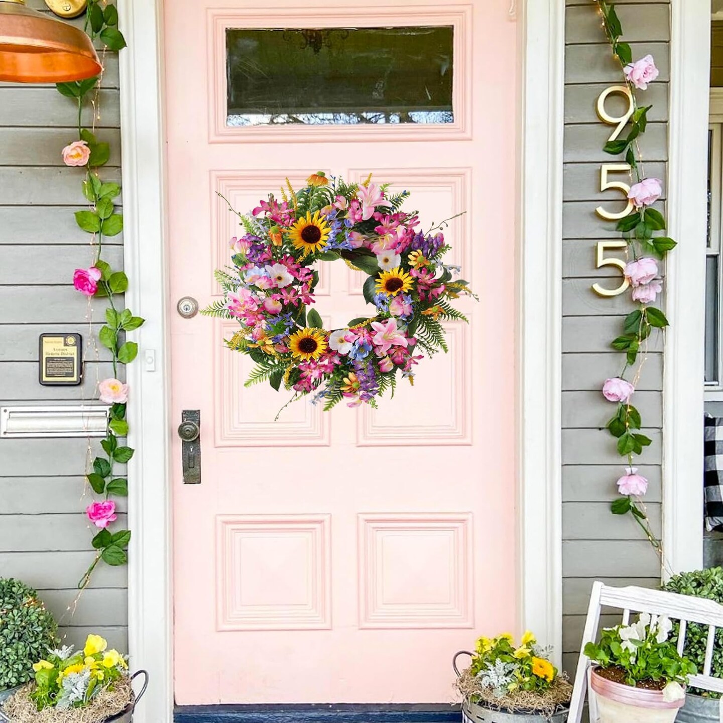 20-22 Inch Summer Floral Wreath Fake Silk Yellow Sunflowers Pink Lily Wild Flowers Floral Wreath with Green Fern Leaves