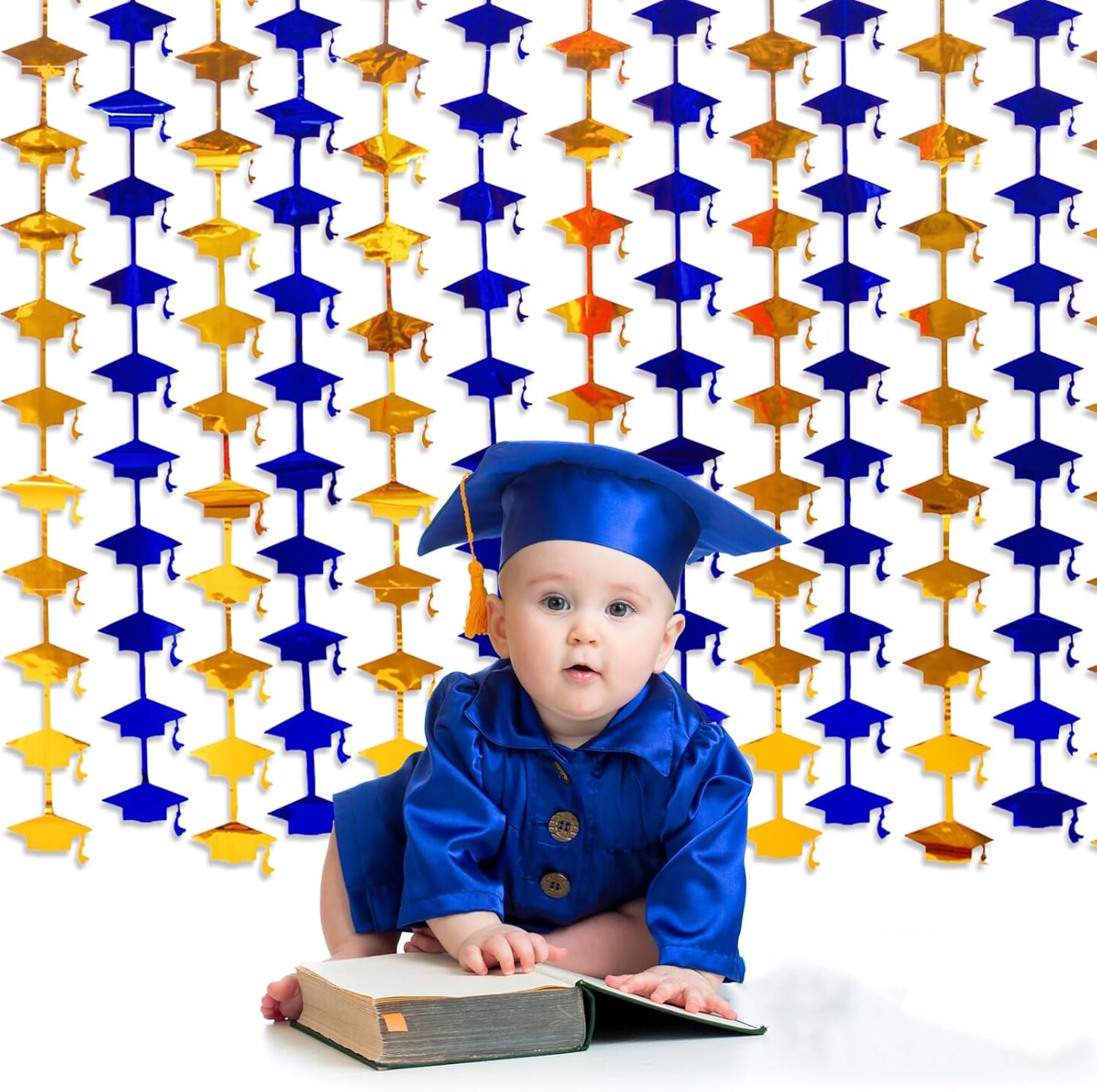 2025 Graduation Party Decorations, 2 Pack Blue and Gold Foil Fringe Curtain 3.3x6.6 ft, Tinsel Streamer, Graduation Photo Booth Prop Streamer Backdrop for High School College University Party