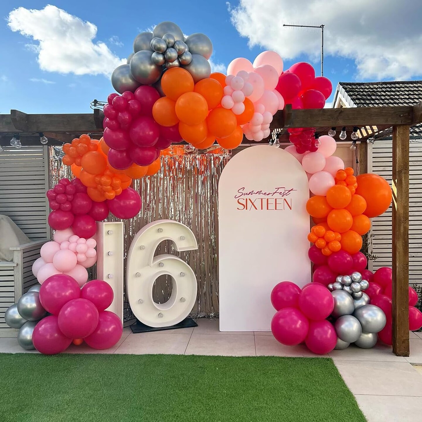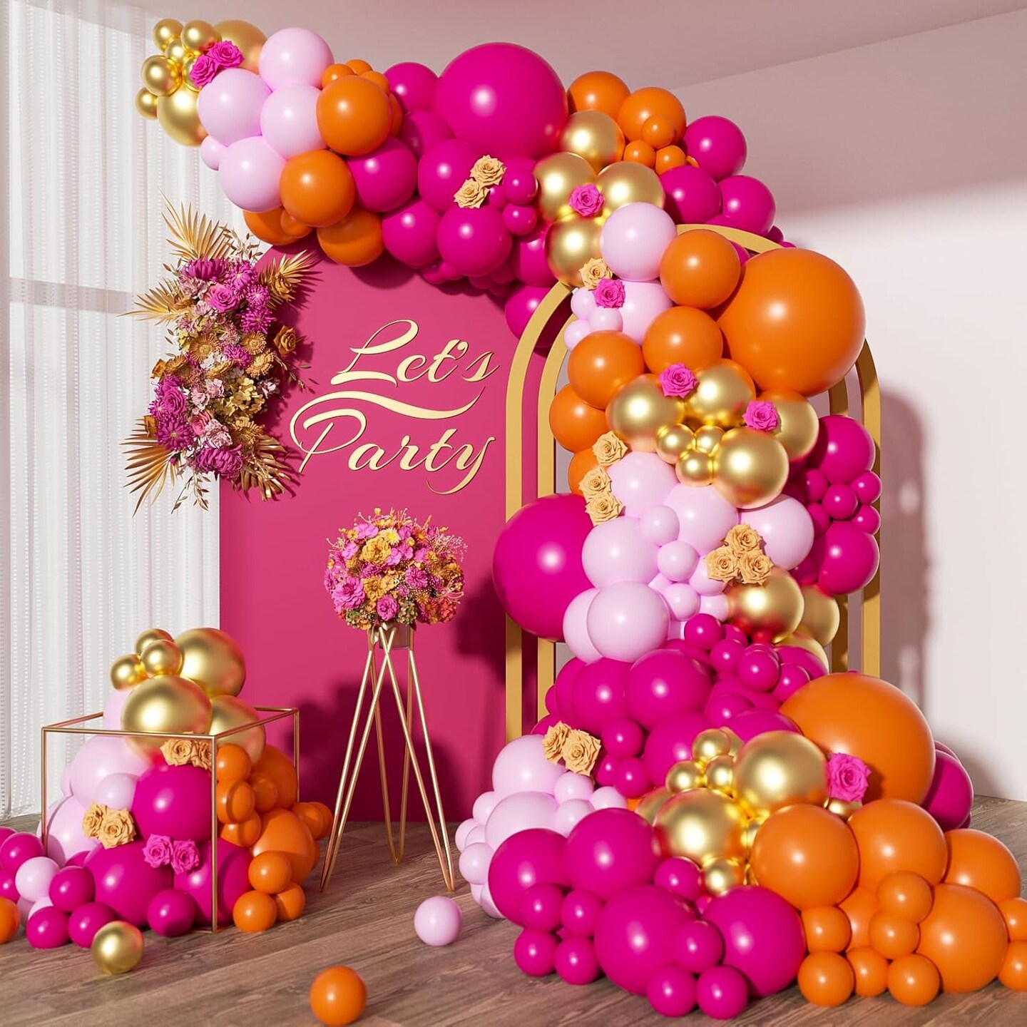 203pcs Pink Orange Balloon Garland Arch Kit, Hot Pink Orange Metallic Gold Latex Balloons for Tropical Engagement Bridal Shower Bachelorette Birthday Party Balloons Decorations