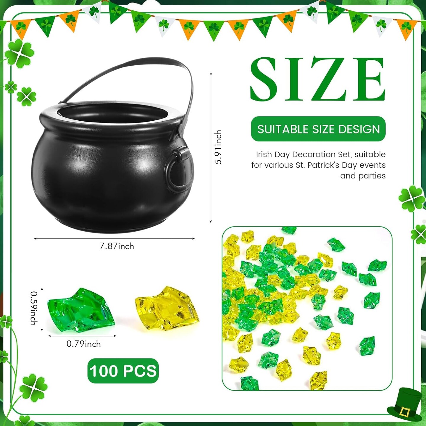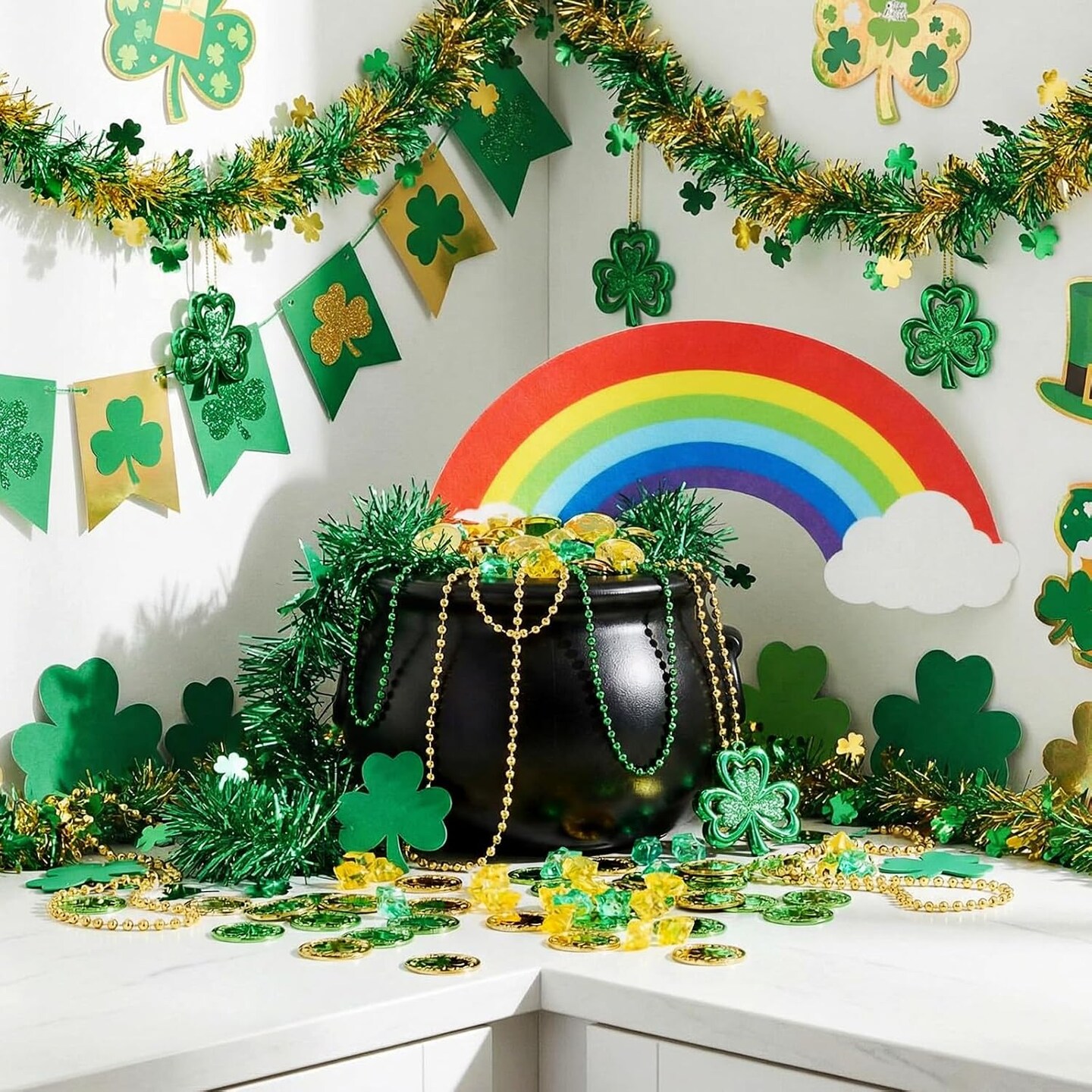 207-Pcs St. Patrick’s Day Decorations Set – Plastic Cauldron, Rainbow Topper, Shamrocks, Coins & Acrylic Gems – St. Patricks Party Supplies