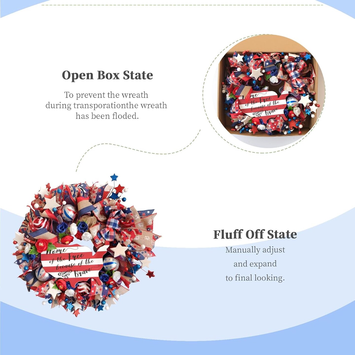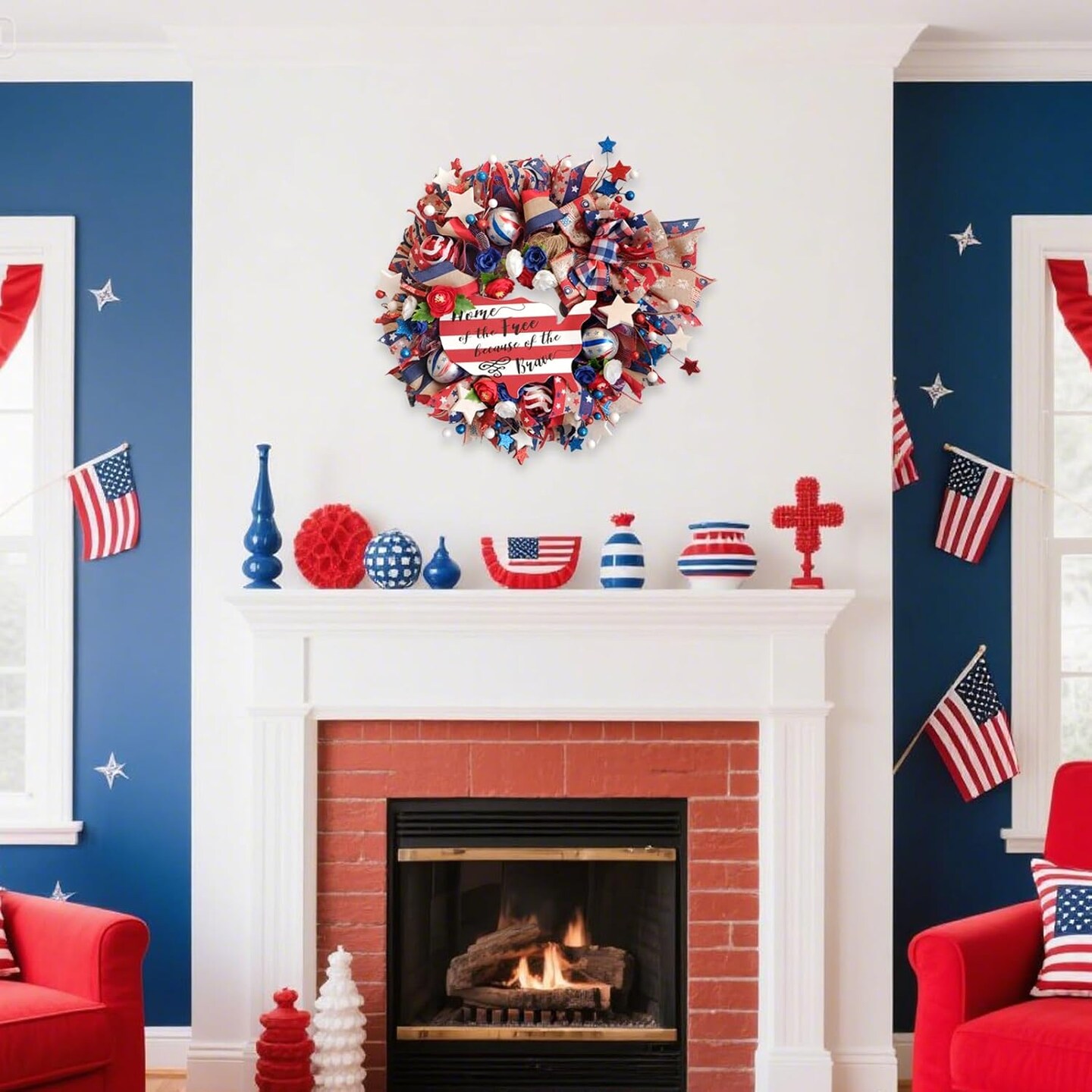 20-inch Fourth of July Wreath American map Patriotic Wreath Front Door Independence Day Handmade Wreaths Red White Blue Flashing Ball Bow Gauze net Decorative Memorial Day Home Decoration