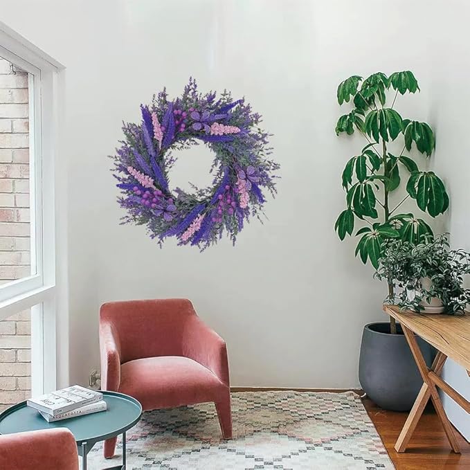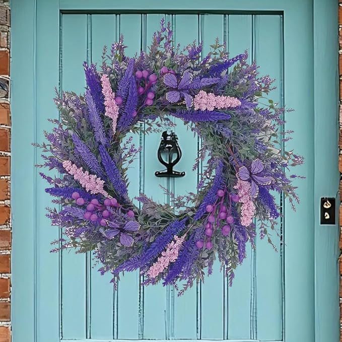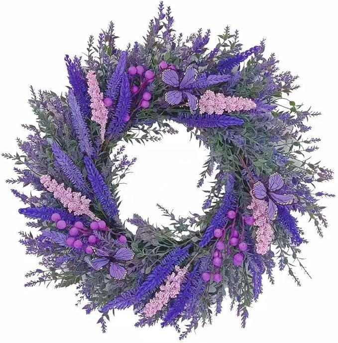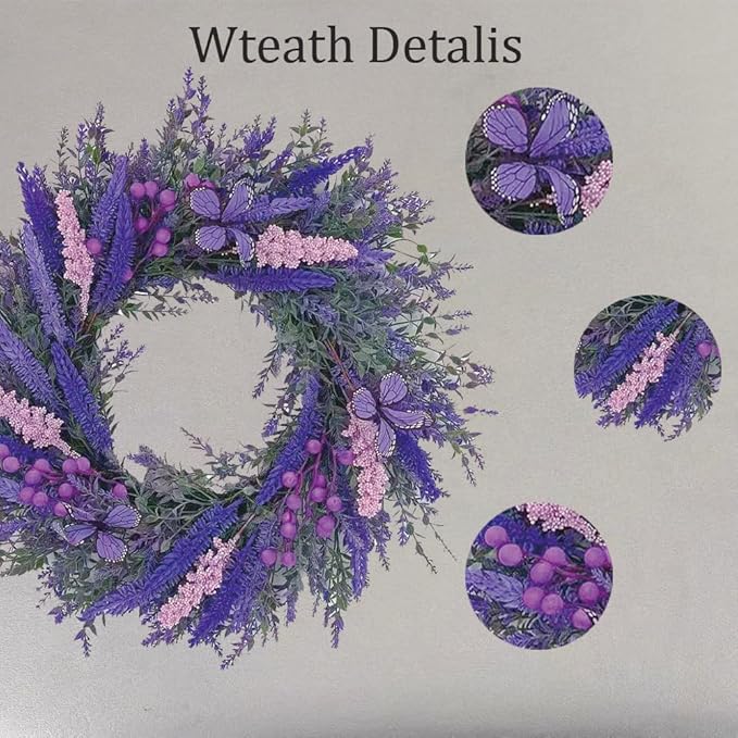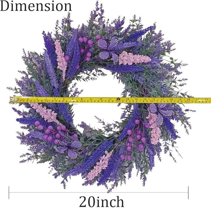 20Inch Purple Lavender Wreath for Front Door,Artificial Lavender, Blueberry, Purple Butterfly,Used for Window, Wall, Porch, and Other Indoor and Outdoor Home Decorations