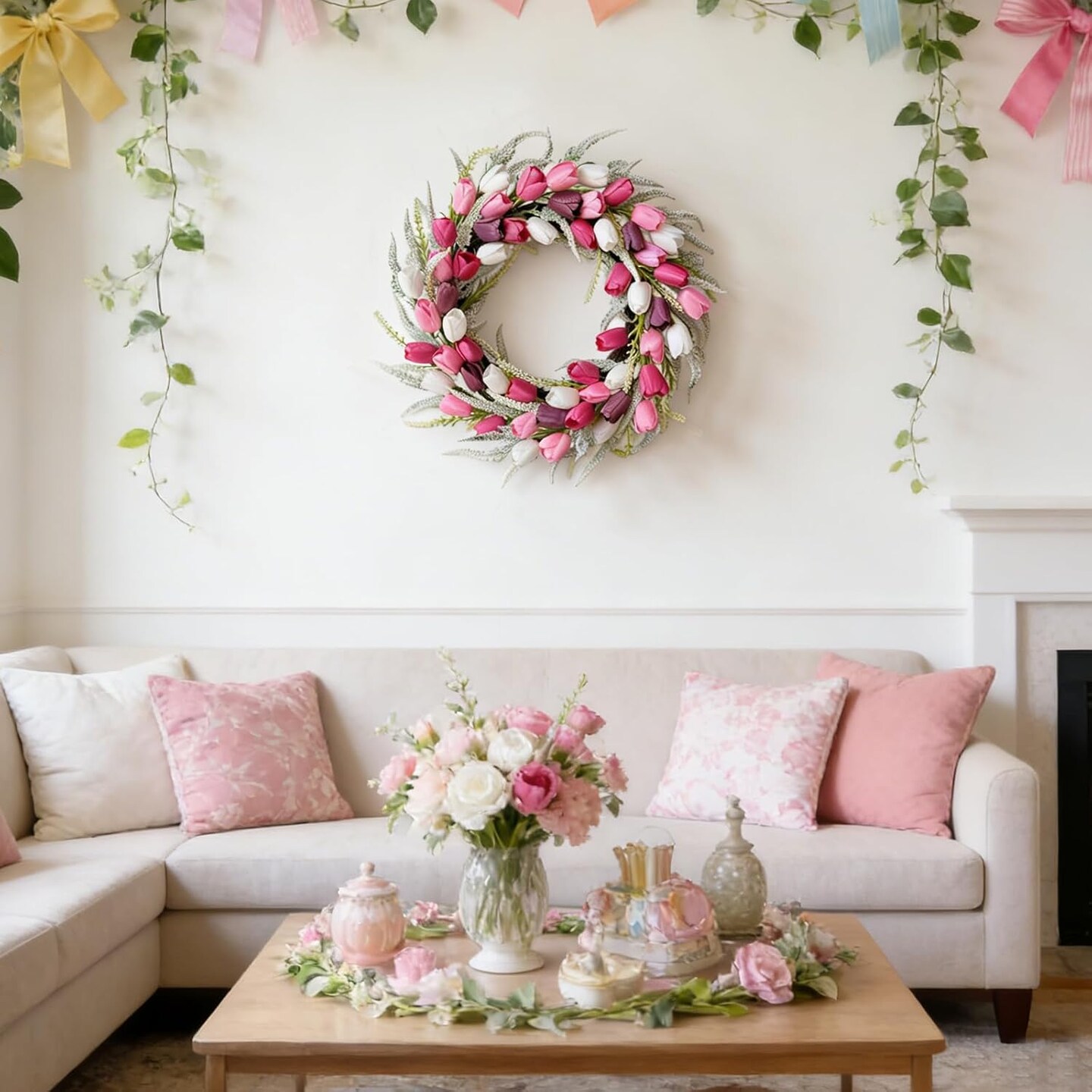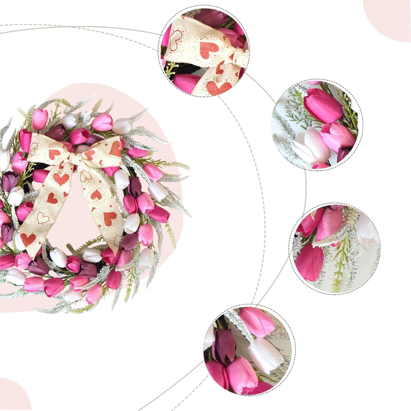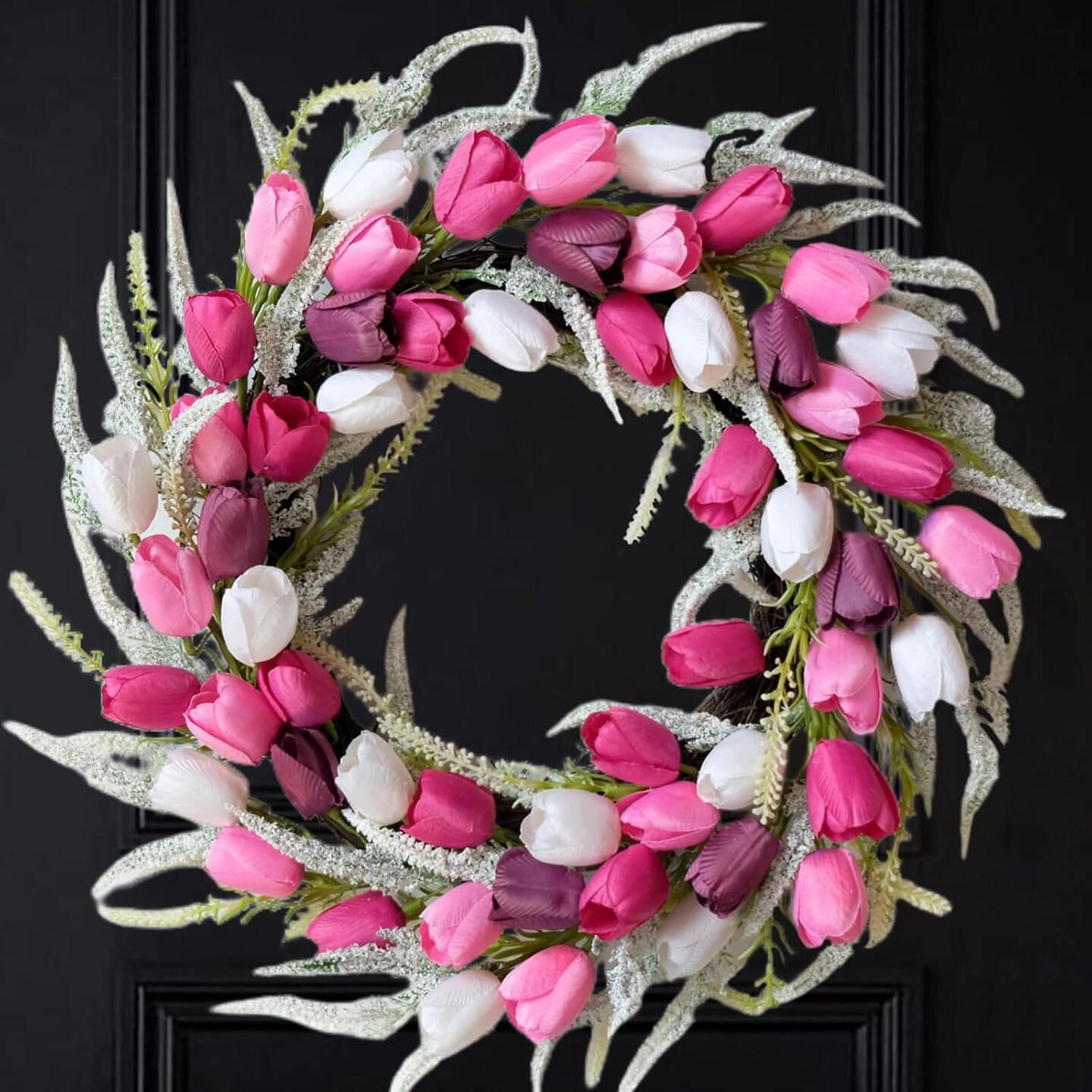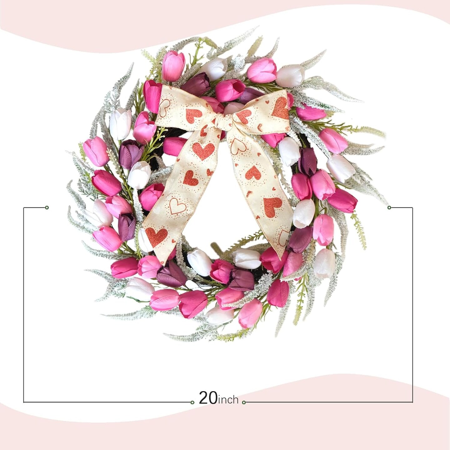 20-Inch Tulip Wreath for Front Door – Pink, White & Purple Artificial Spring & Summer Wreath for Valentine’s Day, Weddings, Window, Wall & Festival Décor