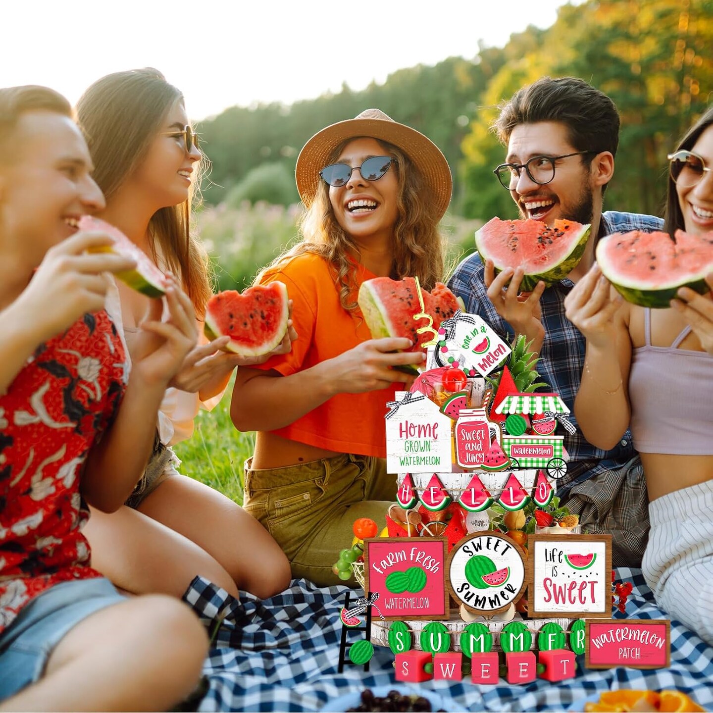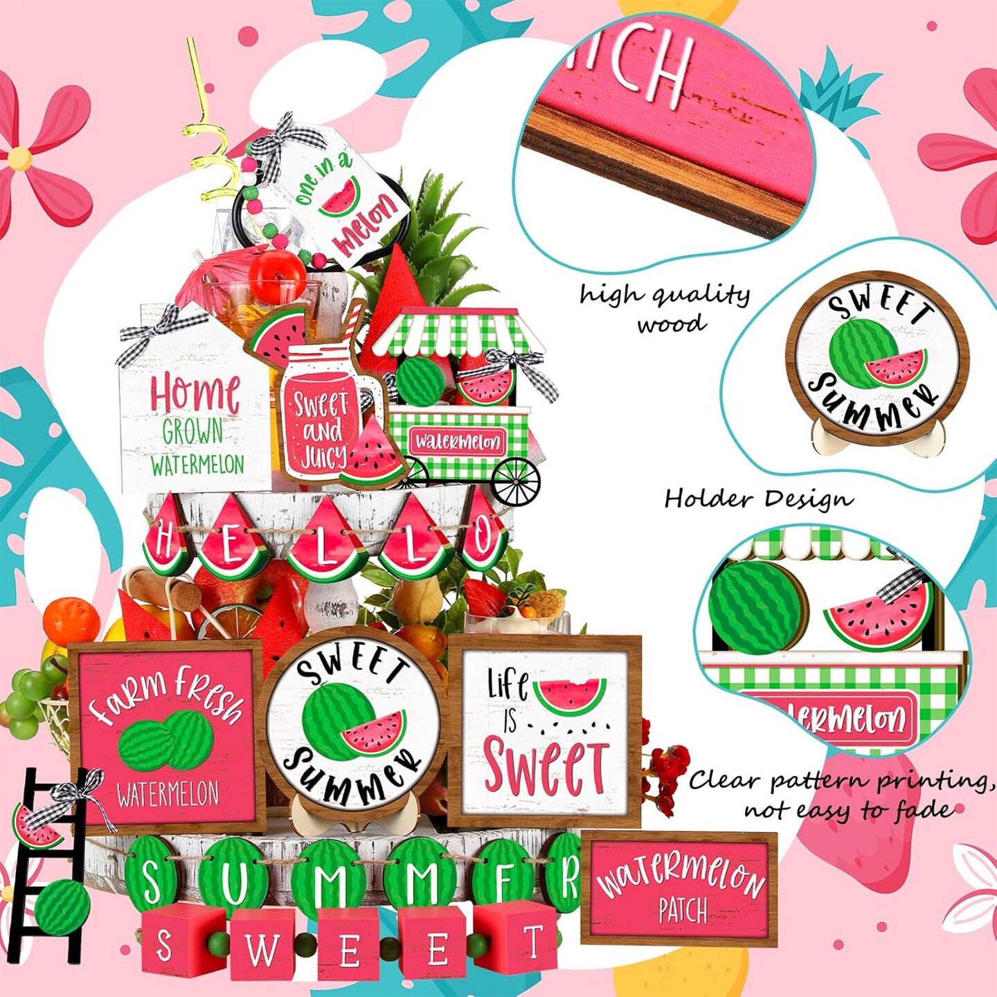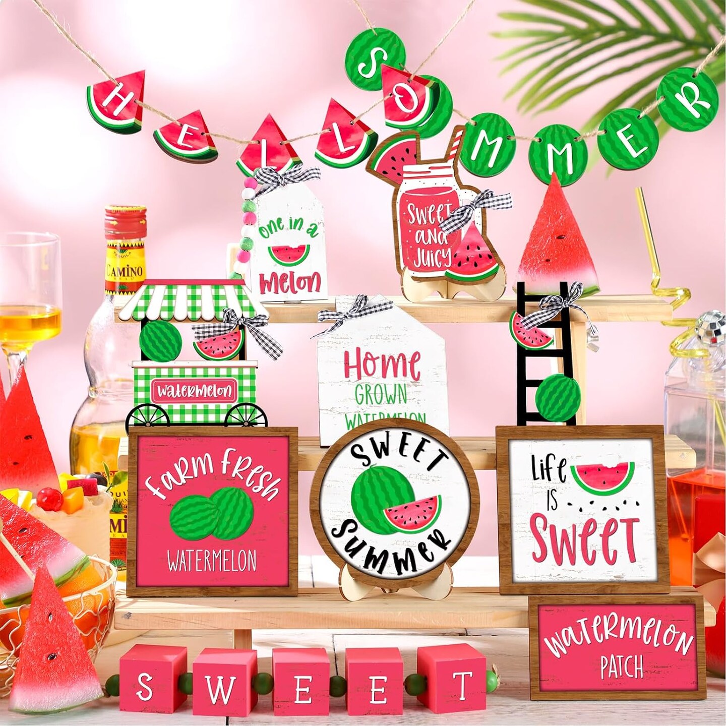 21 Pcs Summer Tiered Tray Decor Watermelon Tiered Tray Decorations Set Hello Summer Wooden Sign Farmhouse Watermelon Table Decorations for Home Kitchen Shelf Tabletop