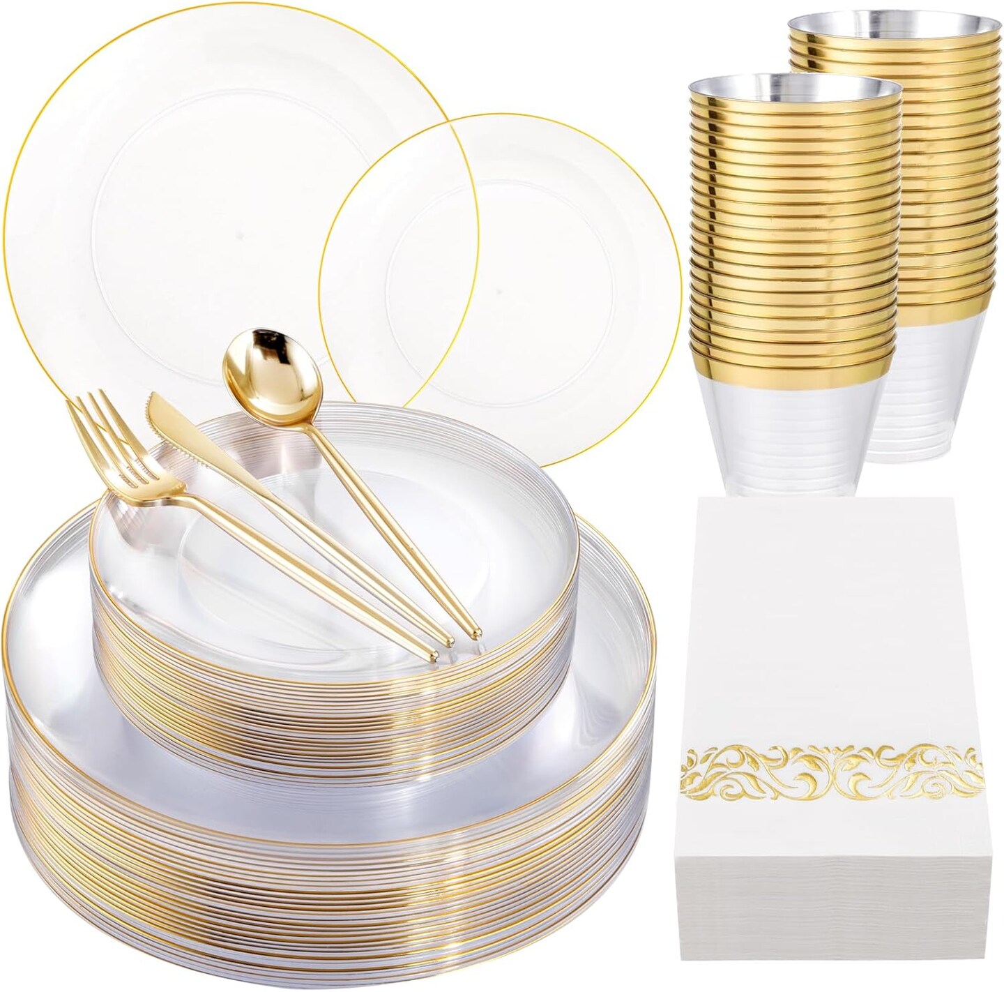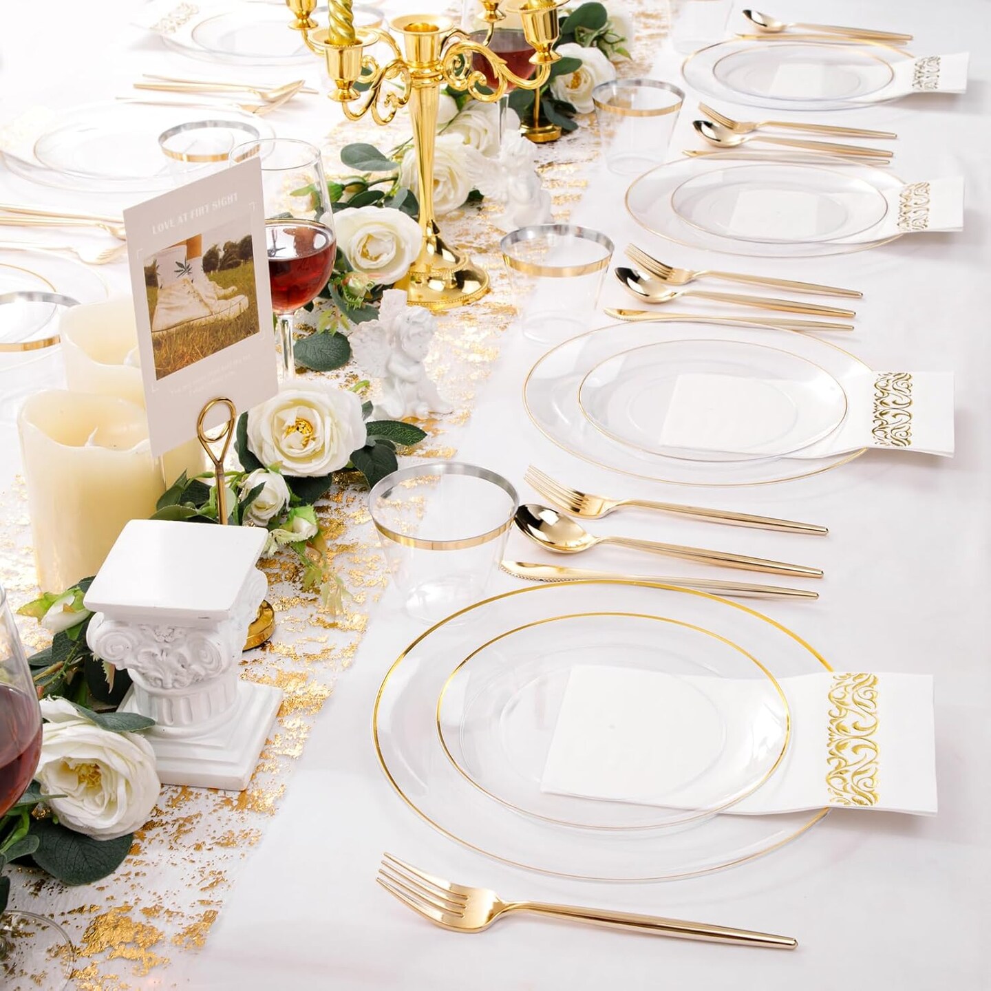 210Pcs Clear and Gold Plates for 30 Guests, Plastic Plates for Party, Includes:30 Gold Dinner Plates, 30 Gold Dessert Plates, 30 Paper Towels with 90 Silverware & 30 Cups MirthMood