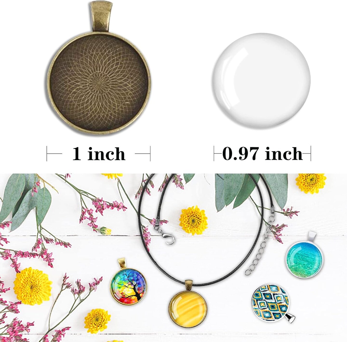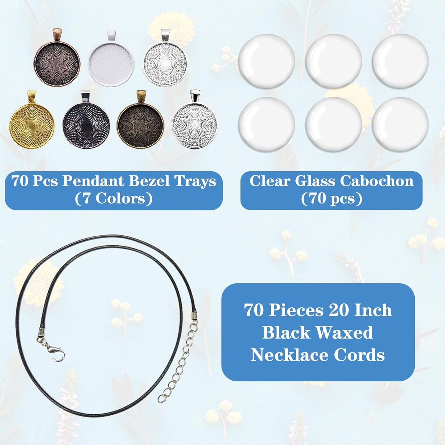 210Pcs Pendant Trays Kit, Bezel Pendant Trays Charms Bulk with Glass Cabochon and Necklace Cords Set for Homemade Necklaces, Jewelry Making, DIY Crafts, Resin Art and Paint Pour Skins