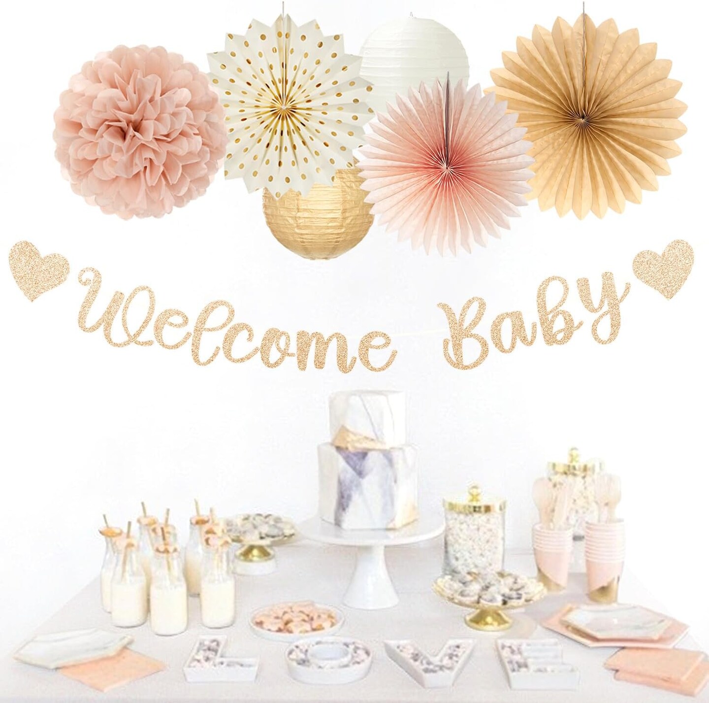 21pcs Girls Welcome Baby Banner,Beige One Sweet Peach Paper Lanterns Pom Poms