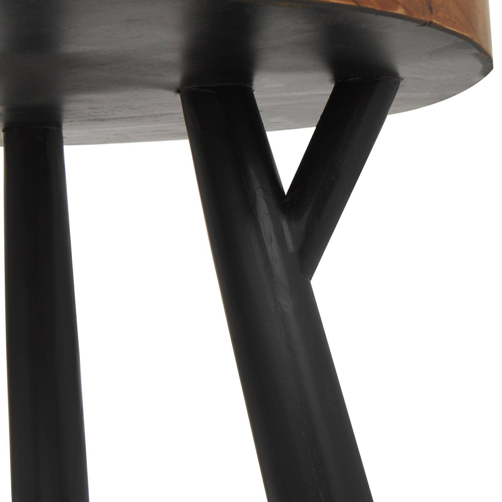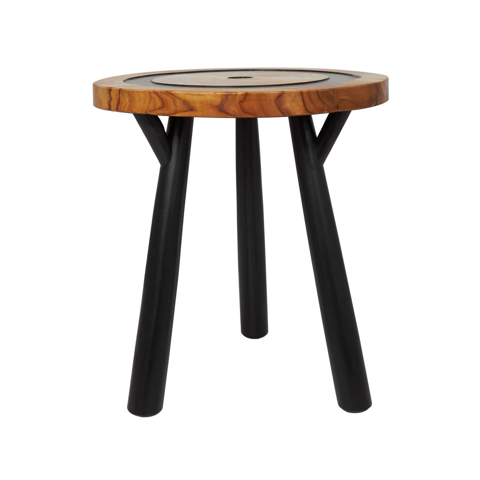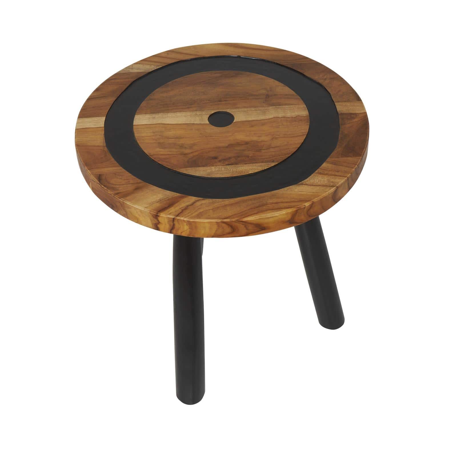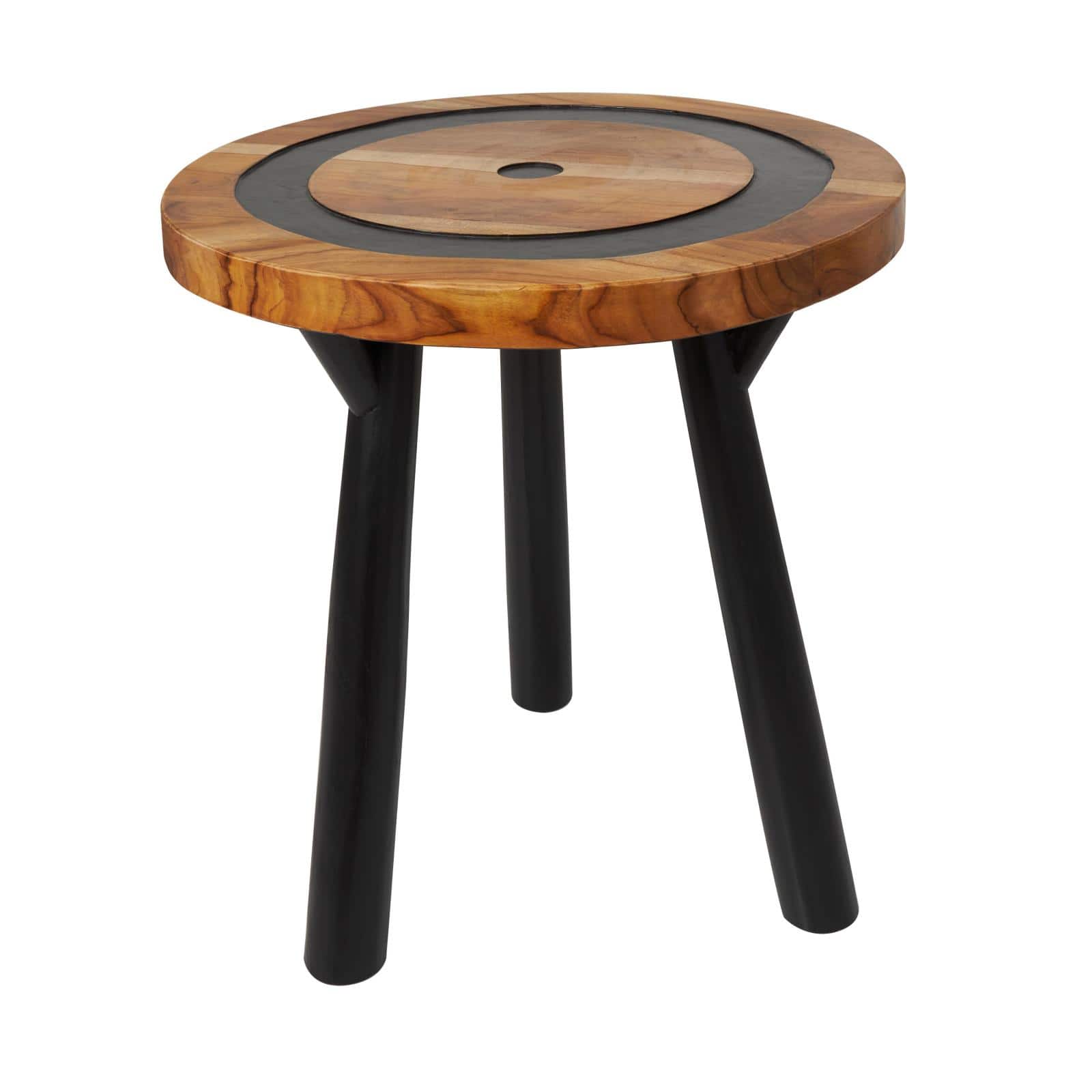 22" Brown Teak Wood Round Accent Table with Geometric Layered Circle Design and Black Legs